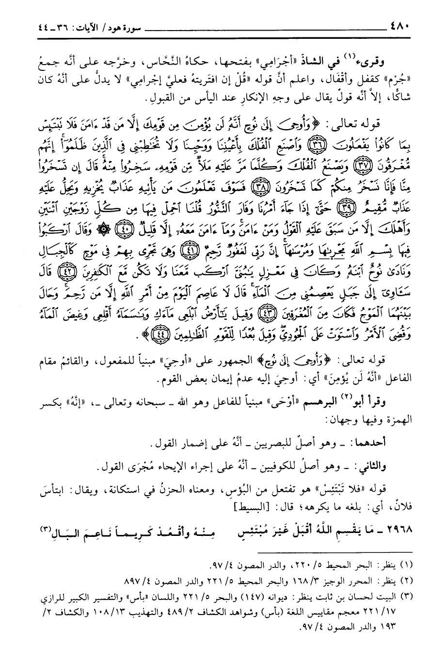 قوله تعالى: {وَأُوحِيَ إلى نُوحٍ} الجمهور على «أوحِيَ» مبنياً للمفعول، والقائمُ مقام الفاعل {أَنَّهُ لَن يُؤْمِنَ} أي: أوحِيَ إليه عدمُ غيمان بعض القوم.