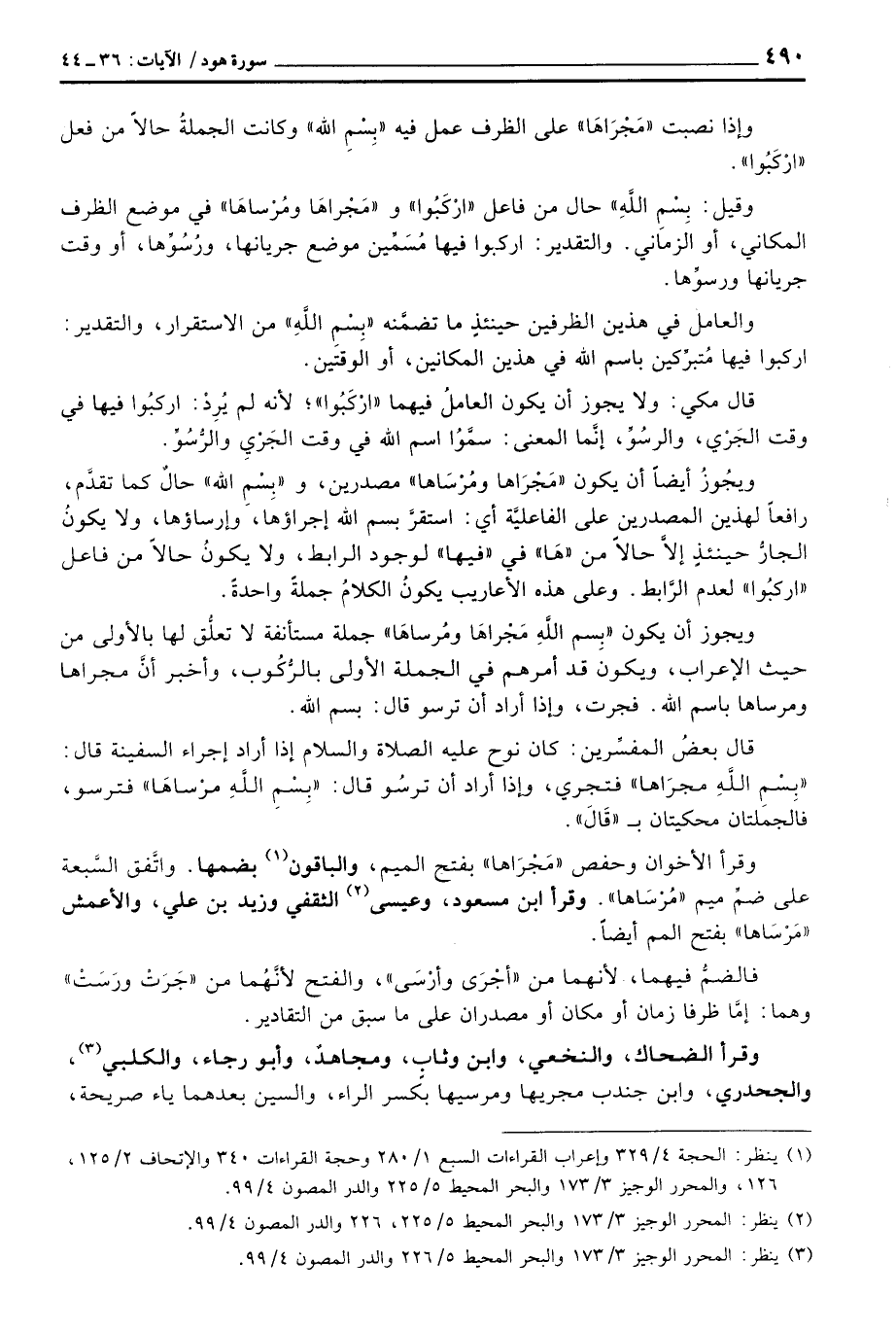 ويجُوزُ أيضاً أن يكون» مَجْرَاهَا ومُرْسَاها «مصدرين، و» بِسْمِ الله «حالٌ كما تقدَّم، رافعاً لهذين المصدرين على الفاعليَّة أي: استقرَّ بسم الله إجراؤها، وإرساؤها، ولا يكونُ الجارُّ حينئذٍ إلاَّ حالاً من» هَا «في» فيها «لوجود الرابط، ولا يكونُ حالاً من فاعل» اركبُوا «لعدم الرَّابط. وعلى هذه الأعاريب يكونُ الكلامُ جملةً واحدةً.