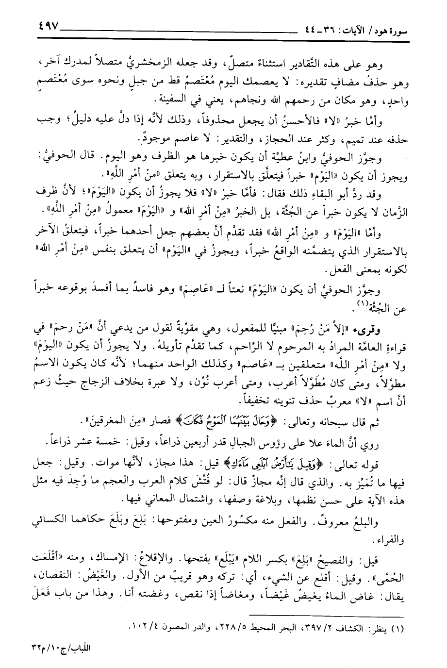 وهو على هذه التَّقادير استثناءٌ متصلٌ، وقد جعله الزمخشريُّ متصلآً لمدرك آخر، وهو حذفُ مضافٍ تقديره: لا يعصمك اليوم مُعْتَصمٌ قط من جبلٍ ونحوه سوى مُعْتَصمٍ واحدٍ، وهو مكان من رحمهم الله ونجاهم، يعني في السفينة.