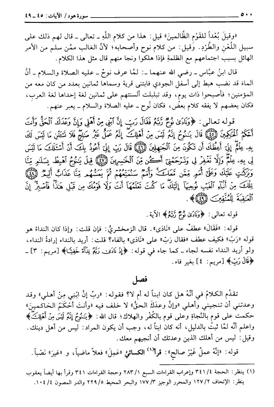 تقدَّم الكلامُ في أنَّهُ هل كان ابناً له أم لا؟ فقوله: {رَبِّ إِنَّ ابني مِنْ أَهْلِي} وقد وعدتني أن تنجيني وأهلي {وَإِنَّ وَعْدَكَ الحق} لا خلف فيه {وَأَنتَ أَحْكَمُ الحاكمين} حكمت على قوم بالنَّجاةِ وعلى قوم بالكُفْر والهلاك؛ قال الله: {يانوح إِنَّهُ لَيْسَ مِنْ أَهْلِكَ} واعلم أنَّه لمَّا ثبت بالدليل، أنه كان ابناً له، وجب أن يكون المراد: ليس من أهل دينك. وقيل: ليس من أهلك الذين وعدتك أن أنجيهم معك.