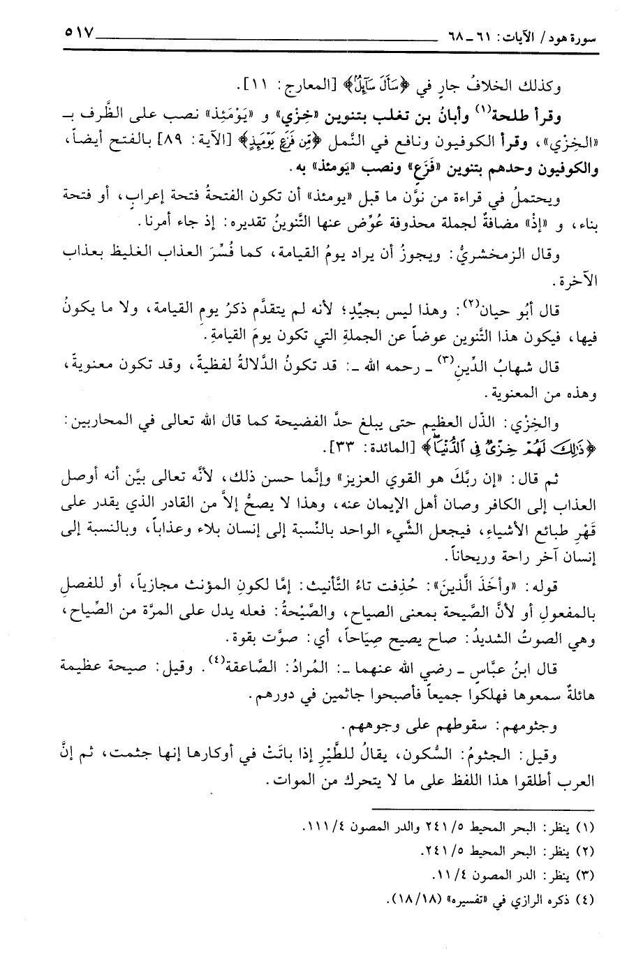 ويحتملُ في قراءة من نوَّن ما قبل «يومئذ» أن تكون الفتحةُ فتحة إعرابٍ، أو فتحة بناء، و «إذْ» مضافةٌ لجملة محذوفة عُوِّض عنها التَّنوينُ تقديره: إذا جاء أمرنا.
