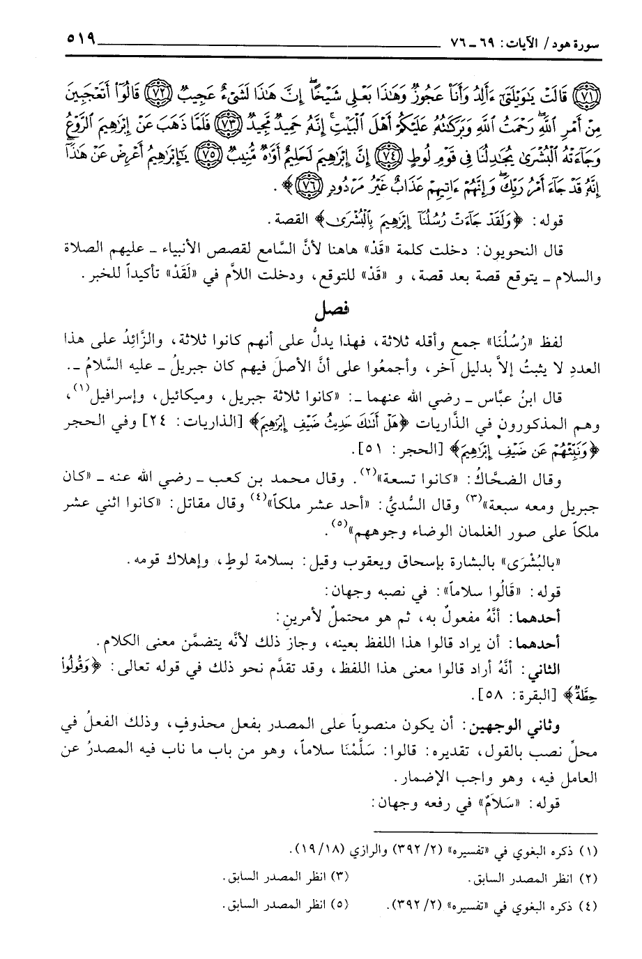 » بالبشرى «بالبشارة بإسحاق ويعقوب وقيل: بسلامة لوطٍ، وأهلاك قومه.