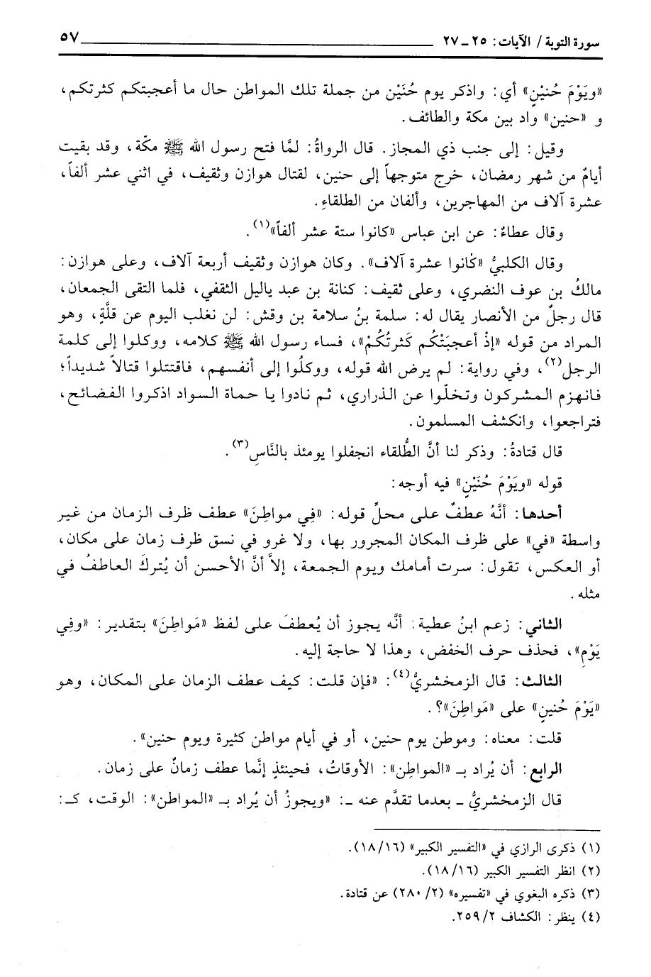 قلت: معناه: وموطن يوم حنين، أو في أيام مواطن كثيرة ويوم حنين» .