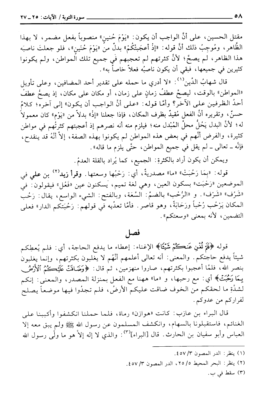 قال شهابُ الدِّين: «لا أدري ما حمله على تقدير أحد المضافين، وعلى تأويل» المواطن «بالوقت، ليصحَّ عطفُ زمانٍ على زمان، أو مكان على مكان، إذ يصحُّ عطفُ أحدُ الظرفين على الآخر؟ وأمَّا قوله:» على أنَّ الواجب أن يكون «إلى آخره؛ كلامٌ حسنٌ، وتقريره أنَّ الفعل مُقيدٌ بظرف المكان، فإذا جعلنا» إذْ «بدلاً من» يَوْم «كان معمولاً له؛ لأنَّ البدل يَحُلُّ محلَّ المُبْدل منه؛ فيلزم منه أنه نصرهم إذ أعجبتهم كثرتُهم في مواطن كثيرة، والفرض أنَّهم في بعض هذه المواطن لم يكونوا بهذه الصفة، إلاَّ أنَّه قد ينقدح، فإنَّه - تعالى - لم يقل في جميع الموطن، حتَّى يلزم ما قاله» .