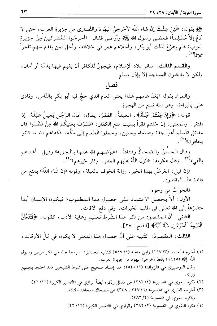 يقول: «لَئِنْ عِشْتُ إنْ شاءَ الله لأخرجنَّ اليهُودَ والنَّصارى من جزيرةِ العربِ، حتى لا أدعُ إلاَّ مُسْلِماً» فمضى رسول الله صَلَّى اللَّهُ عَلَيْهِ وَسَلَّم َ وأوصى فقال: «أخرجُوا المُشركينَ مِنْ جزيرةِ العرب» فلم يتفرَّغ لذلك أبو بكر، وأجلاهم عمر في خلافته، وأحل لمن يقدم منهم تاجراً ثلاثاً.