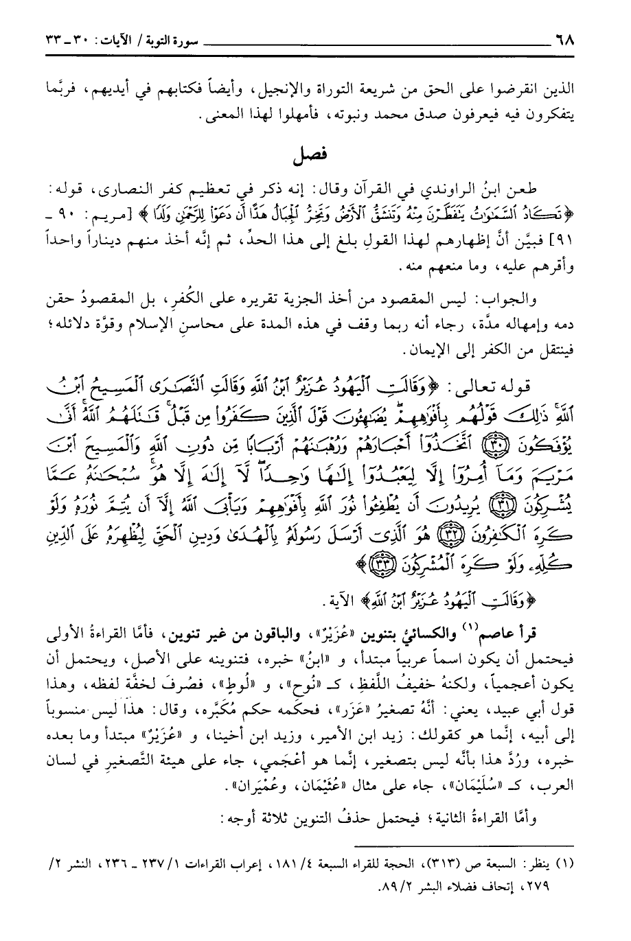 قرأ عاصم والكسائيُّ بتنوين «عُزَيْرٌ» ، والباقون من غير تنوين، فأمَّا القراءةُ الأولى فيحتمل أن يكون اسماً عربياً مبتدأ، و «ابنُ» خبره، فتنوينه على الأصل، ويحتمل أن يكون أعجمياً، ولكنهُ خفيفُ اللَّفظِ، ك «نُوحِ» ، و «لُوطٍ» ، فصُرفَ لخفَّة لفظه، وهذا قول أبي عبيد، يعني: أنَّهُ تصغيرُ «عَزَر» ، فحكَمه حكم مُكَبَّره، وقال: هذا ليس منسوباً إلى أبيه، إنَّما هو كقولك: زيد ابن الأمير، وزيد ابن أخينا، و «عُزَيْرٌ» مبتدأ وما بعده خبره، ورُدَّ هذا بأنَّه ليس بتصغير، إنَّما هو أعْجَمي، جاء على هيئة التَّصغيرِ في لسان العرب، ك «سُلَيْمَان» ، جاء على مثال «عُثَيْمَان، وعُمْيَران» .