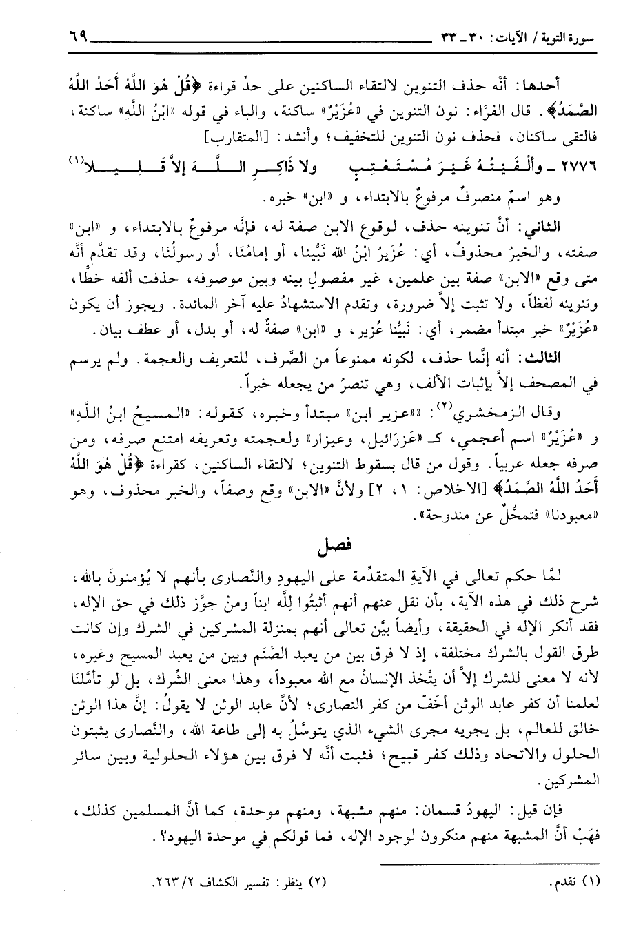 وقال الزمخشري: «عزير ابن» مبتدأ وخبره، كقوله: {المسيح ابن الله} و «عُزَيْرٌ» اسم أعجمي،: «عَزرَائيل، وعيزار» ولعجمته وتعريفه امتنع صرفه، ومن صرفه جعله عربياً. وقول من قال بسقوط التنوين؛ لالتقاء الساكنين، كقراءة {قُلْ هُوَ الله أَحَدٌ الله الصمد} [الإخلاص: 1، 2] ولأنَّ «الابن» وقع وصفاً، والخبر محذوف، وهو «معبودنا» فتمحُّلٌ عن مندوحة «.