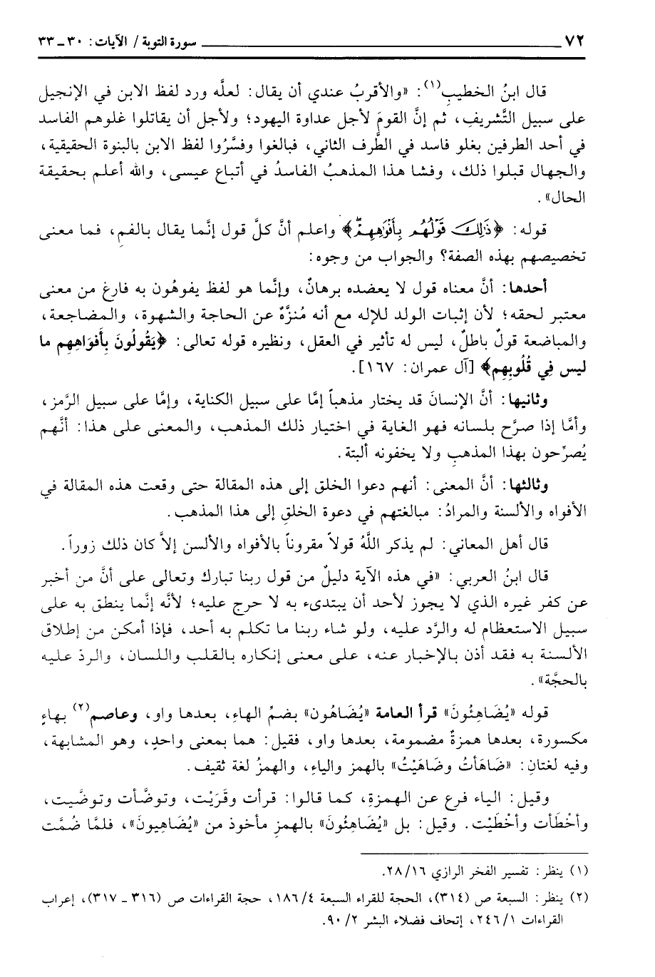 وقيل: الياء فرع عن الهمزةِ، كما قالوا: قرأ وقَرَيْت، وتوضَّأت وتوضَّيت، وأخْطَأت وأخْطَيْت. وقيل: بل «يُضَاهِئُونَ» بالهمزِ مأخوذ من «يُضَاهِيونَ» ، فلمَّا ضُمَّت