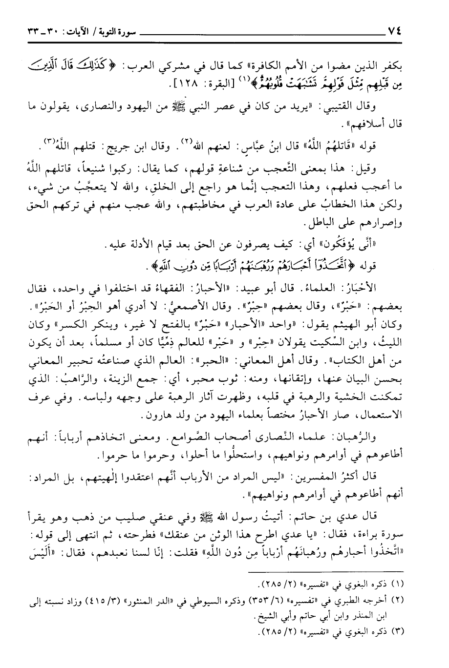 قال عدي بن حاتم: «أتيتُ رسول الله صَلَّى اللَّهُ عَلَيْهِ وَسَلَّم َ وفي عنقي صليب من ذهب وهو يقرأ سورة براءة، فقال:» يا عدي اطرح هذا الوثن من عنقك «فطرحته، ثم انتهى إلى قوله: {اتخذوا أَحْبَارَهُمْ وَرُهْبَانَهُمْ أَرْبَاباً مِّن دُونِ الله} فقلت: إنّا لنسا نعبدهم، فقال:» أَلَيْسَ
