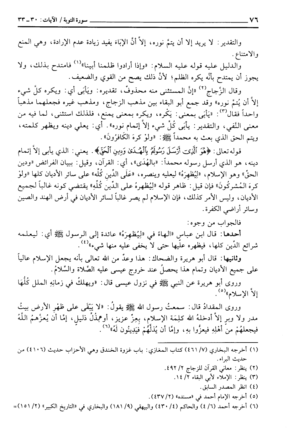 وقال الزَّجاج «إنَّ المستثنى منه محذوفٌ، تقديره: ويَأبَى أي: ويكره كلَّ شيء إلاَّ أن يُتمَّ نوره» وقد جمع أبو البقاء بين مذهب الزجاج، ومذهب غيره فجعلهما مذهباً واحداً فقال: «يَأبَى بمعنى: يَكْره، ويكره بمعنى يمنع، فلذلك استثنى، لما فيه من معنى النَّفْي، والتقدير: يأبَى كُلَّ شيء إلاَّ إتمام نوره» . أي: يعلي دينه ويظهر كلمته، ويتم الحق الذي بعث به محمداً صَلَّى اللَّهُ عَلَيْهِ وَسَلَّم َ: {وَلَوْ كَرِهَ الكافرون} .