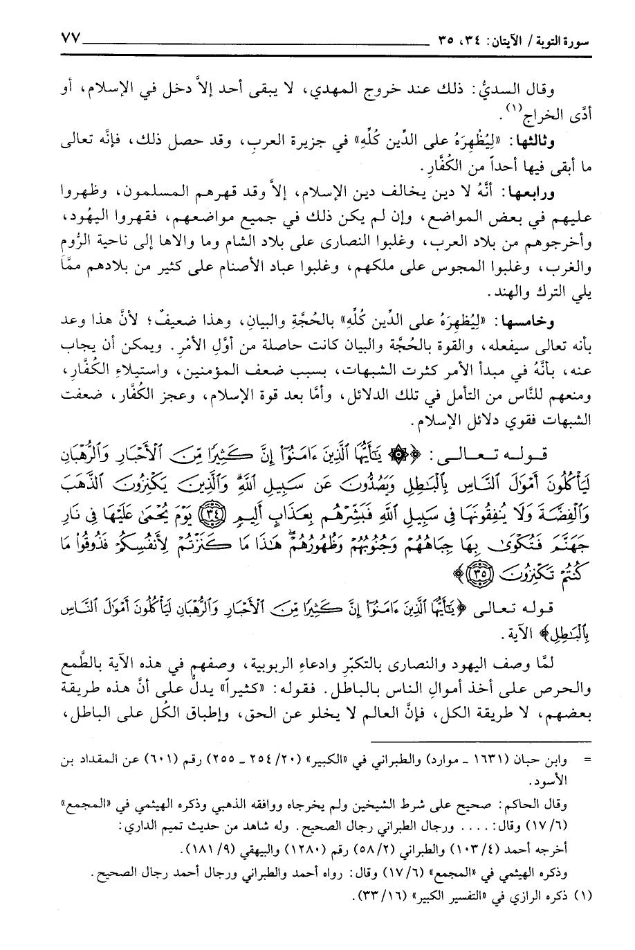 لمَّا وصف اليهود والنصارى بالتكبّرِ وادعاءِ الربوبية، وصفهم في هذه الآية بالطَّمع والحرص على أخذ أموالِ الناس بالباطل. فقوله: «كثيراً» يدلُّ على أنَّ هذه طريقة بعضهم، لا طريقة الكل، فإنَّ العالم لا يخلو عن الحق، وإطباق الكُل على الباطل،