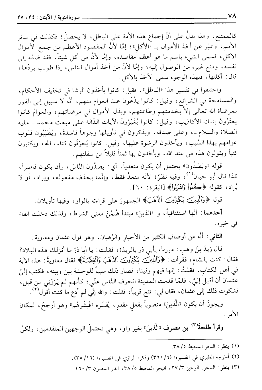 واختلفوا في تفسير هذا «الباطل» . فقيل: كانوا يأخذون الرشا في تخفيف الأحكام، والمسامحة في الشرائع، وقيل: كانوا يدَّعُون عند العوام منهم، أنَّه لا سبيل إلى الفوز بمرضاة الله تعالى إلاَّ بخدمتهم وطاعتهم، وبذل الأموال في مرضاتهم، والعوامُ كانوا يغْتَرُّونَ بتلك الأكاذيب، وقيل: كانوا يُغَيِّرُونَ الآيات الدَّالة على مبعث محمد - عَلَيْهِ الصَّلَاة وَالسَّلَام ُ -، وعلى صدقه، ويذكرون في تأويلها وجوهاً فاسدةً، ويُطَيِّبُون قلوب عوامهم بهذا السَّبب، ويأخذون الرشوة عليهم، وقيل: كانوا يُحرِّفُون كتاب الله، ويكتبون كتباً ويقولون هذه من عند الله، ويأخذون بها ثمناً قليلاً من سفلتهم.