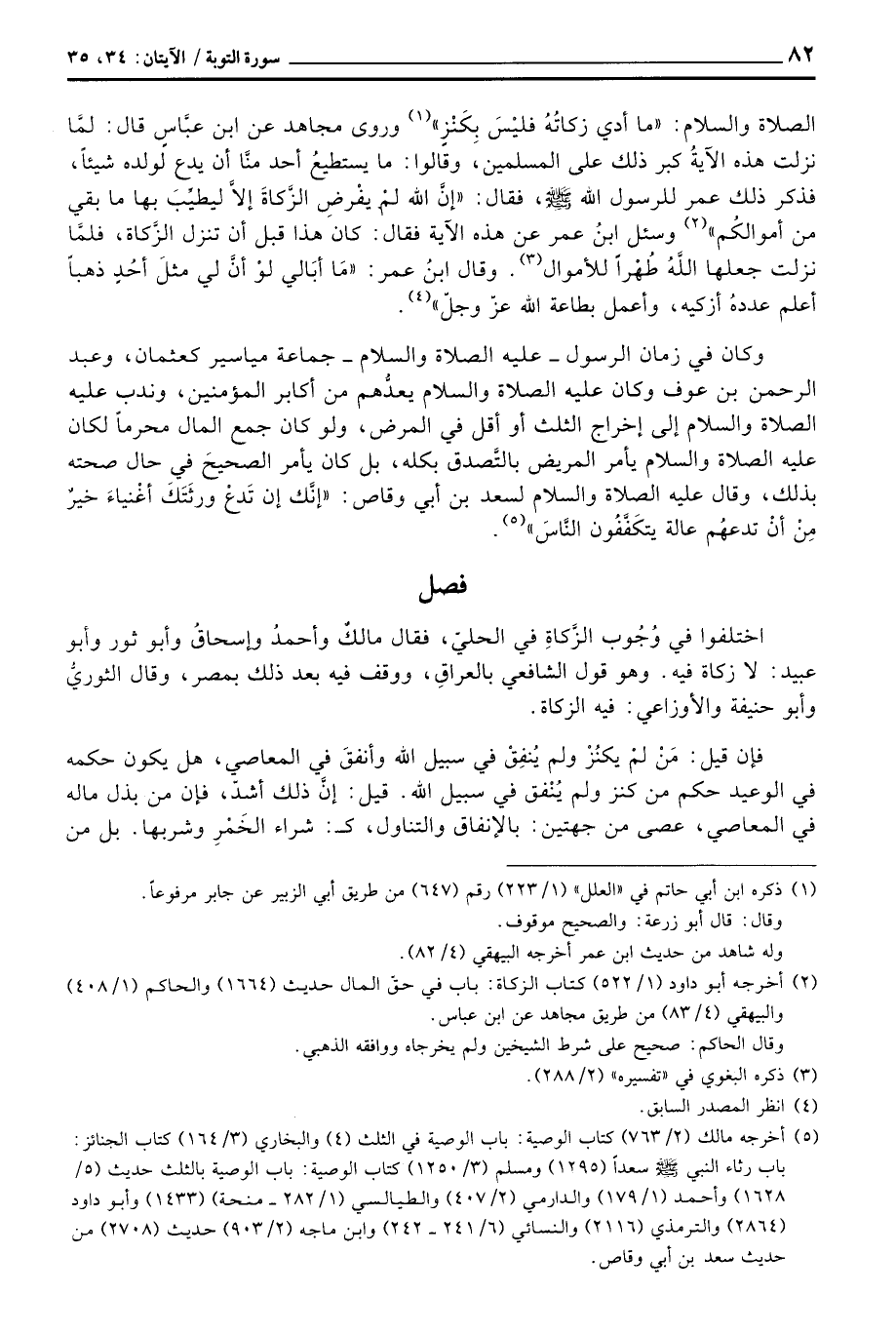 الصَّلَاة وَالسَّلَام ُ: «ما أدي زكاتُهُ فليْسَ بِكَنْزٍ» وروى مجاهد عن ابن عبَّاسٍ قال: لمَّا نزلت هذه الآيةُ كبر ذلك على المسلمين، وقالوا: ما يستطيعُ أحد منَّا أن يدع لولده شيئاً، فذكر ذلك عمر للرسول الله صَلَّى اللَّهُ عَلَيْهِ وَسَلَّم َ، فقال: «إنَّ الله لمْ يفْرضِ الزَّكاةَ إلاَّ ليطيِّبَ بها ما بقي من أموالكُم» وسئل ابنُ عمر عن هذه الآية فقال: كان هذا قبل أن تنزل الزَّكاة، فلمَّا نزلت جعلها اللهُ طُهْراً للأموال. وقال ابنُ عمر: «مَا أبَالي لوْ أنَّ لي مثلَ أحُدٍ ذهباً أعلم عددهُ أزكيه، وأعمل بطاعة الله عزَّ وجلَّ» .
