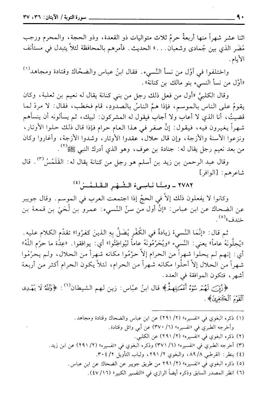 2782 - ومِنَّا نَاسِىءُ الشَّهْرِ القَلمَّسْ ... وكانوا لا يفعلون ذلك إلاَّ في الحجِّ إذا اجتمعت العرب في الموسم. وقال جويبر عن الضحاك عن ابن عباس:» إنَّ أول من سنَّ النَّسيء: عمرو بن لُحَيّ بن قمعة بن خندف «.