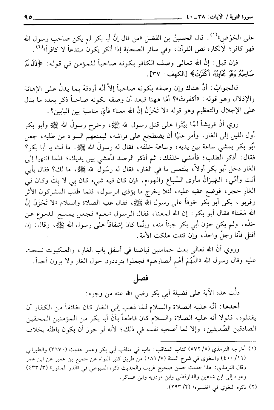 روي أنَّ قريشاً لمَّا بيَّتُوا على قتل رسول الله صَلَّى اللَّهُ عَلَيْهِ وَسَلَّم َ، وخرج رسولُ الله صَلَّى اللَّهُ عَلَيْهِ وَسَلَّم َ وأبو بكر أول الليل إلى الغار، وأمر عليّاً أن يضطجع على فراشه، ليمنعهم السواد من طلبه، جعل أبُو بكر يمشي ساعة بين يديه، وساعة خلفه، فقال له رسولُ الله صَلَّى اللَّهُ عَلَيْهِ وَسَلَّم َ: «ما لك يا أبا بكر؟ فقال: أذكر الطلب؛ فأمشي خلفك، ثم أذكر الرصد فأمشي بين يديك؛ فلما انتهينا إلى الغار دخل أبو بكر أولاً، يلتمس ما في الغار، فقال له رسُول الله صَلَّى اللَّهُ عَلَيْهِ وَسَلَّم َ، ما لك؟ فقال بأبي أنت وأمِّي، الغيرَانُ مأوى السِّباع والهوام، فإن كان فيه شيء كان بِي لا بِكَ وكان في الغارِ حجر، فوضع عقبه عليه، لئلا يخرج ما يؤذي الرسول، فلما طلب المشركون الأثر وقربوا، بكى أبو بكر خوفاً على رسول الله صَلَّى اللَّهُ عَلَيْهِ وَسَلَّم َ، فقال عَلَيْهِ الصَّلَاة وَالسَّلَام ُ» لا تَحْزَنْ إنَّ الله مَعَنَا «فقال أبو بكر: إن الله لمعنا، فقال الرسول» نعم «فجعل يمسح الدموع عن خدِّه، ولم يكن حزن أبي بكر جبناً منه، وإنَّما إشفاقاً على رسول الله صَلَّى اللَّهُ عَلَيْهِ وَسَلَّم َ، وقال: إن أقتل فأناً رجلٌ واحدٌ، وإن قتلت هلكت الأمة.»