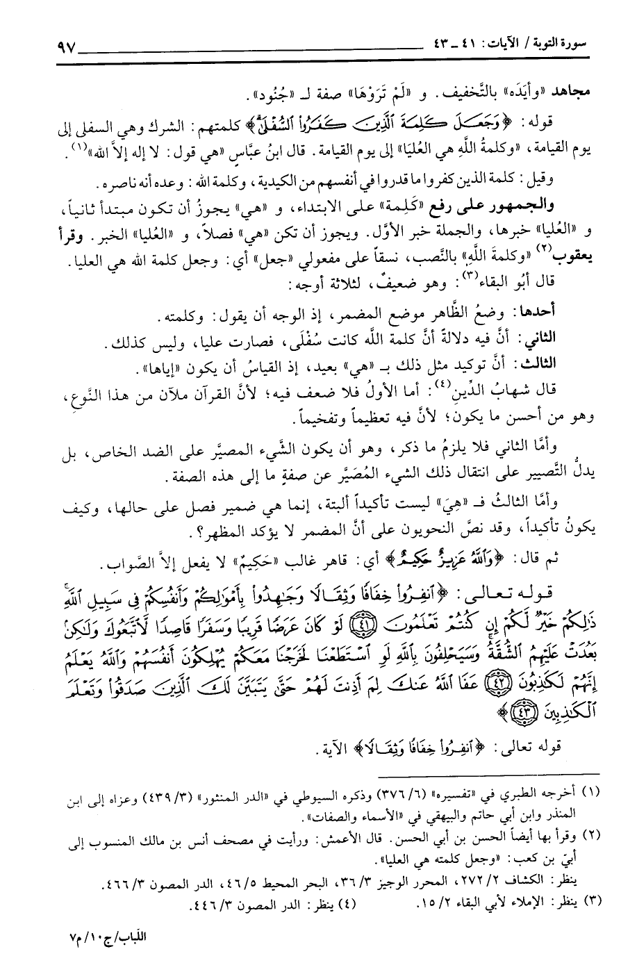 قوله: {وَجَعَلَ كَلِمَةَ الذين كَفَرُواْ السفلى} كلمتهم: الشرك وهي السفلى إلى يوم القيامة، {وَكَلِمَةُ الله هِيَ العليا} إلى يوم القيامة. قال ابنُ عبَّاسٍ «هي قول: لا إله إلاَّ الله» .