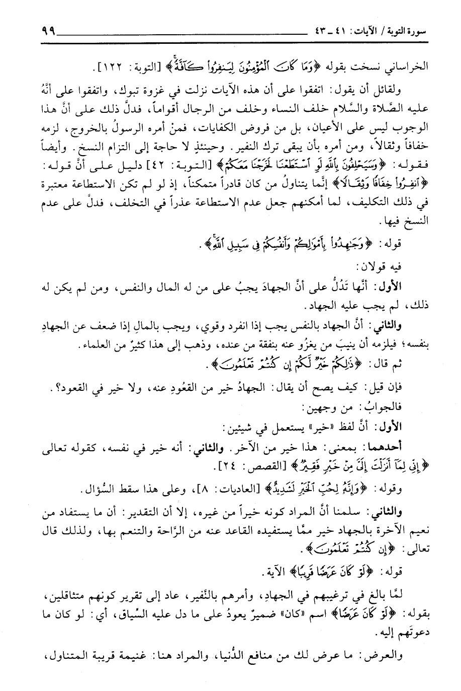 ولقائل أن يقول: اتفقوا على أن هذه الآيات نزلت في غزوة تبوك، واتفقوا على أنَّهُ عليه الصَّلاة والسَّلام خلف النساء وخلف من الرجال أقواماً، فدلَّ ذلك على أنَّ هذا الوجوب ليس على الأعيان، بل من فروض الكفايات، فمنْ أمره الرسولُ بالخروج، لزمه خفافاً وثقالاً، ومن أمره بأن يبقى ترك النفير. وحينئذٍ لا حاجة إلى التزام النسخ.