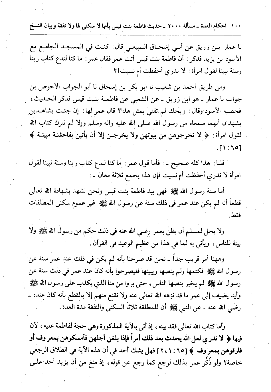 وَأَمَّا كِتَابُ اللَّهِ تَعَالَى فَقَدْ بَيَّنَهُ، إذْ أَتَى بِالْآيَةِ الْمَذْكُورَةِ وَهِيَ حُجَّةٌ لِفَاطِمَةَ عَلَيْهِ؛ لِأَنَّ فِيهَا {لا تَدْرِي لَعَلَّ اللَّهَ يُحْدِثُ بَعْدَ ذَلِكَ أَمْرًا} [الطلاق: 1] {فَإِذَا بَلَغْنَ أَجَلَهُنَّ فَأَمْسِكُوهُنَّ بِمَعْرُوفٍ أَوْ فَارِقُوهُنَّ بِمَعْرُوفٍ} [الطلاق: 2] فَهَلْ يَشُكُّ أَحَدٌ فِي أَنَّ هَذِهِ الْآيَةَ فِي الطَّلَاقِ الرَّجْعِيِّ خَاصَّةً؟ وَلَوْ ذُكِّرَ عُمَرُ بِذَلِكَ لَرَجَعَ كَمَا رَجَعَ عَنْ قَوْلِهِ، إذْ مَنَعَ مِنْ أَنْ يَزِيدَ أَحَدٌ عَلَى