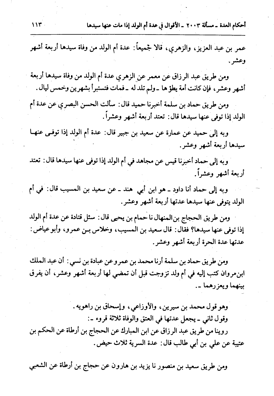 وَمِنْ طَرِيقِ الْحَجَّاجِ بْنِ الْمِنْهَالِ أَنَا حُمَامُ بْنُ يَحْيَى قَالَ: سُئِلَ قَتَادَةُ عَنْ عِدَّةِ أُمِّ الْوَلَدِ إذَا تُوُفِّيَ عَنْهَا سَيِّدُهَا؟ فَقَالَ: قَالَ سَعِيدُ بْنُ الْمُسَيِّبِ، وَخِلَاسُ بْنُ عَمْرٍو، وَأَبُو عِيَاضٍ: عِدَّتُهَا عِدَّةُ الْحُرَّةِ أَرْبَعَةُ أَشْهُرٍ وَعَشْرٌ.