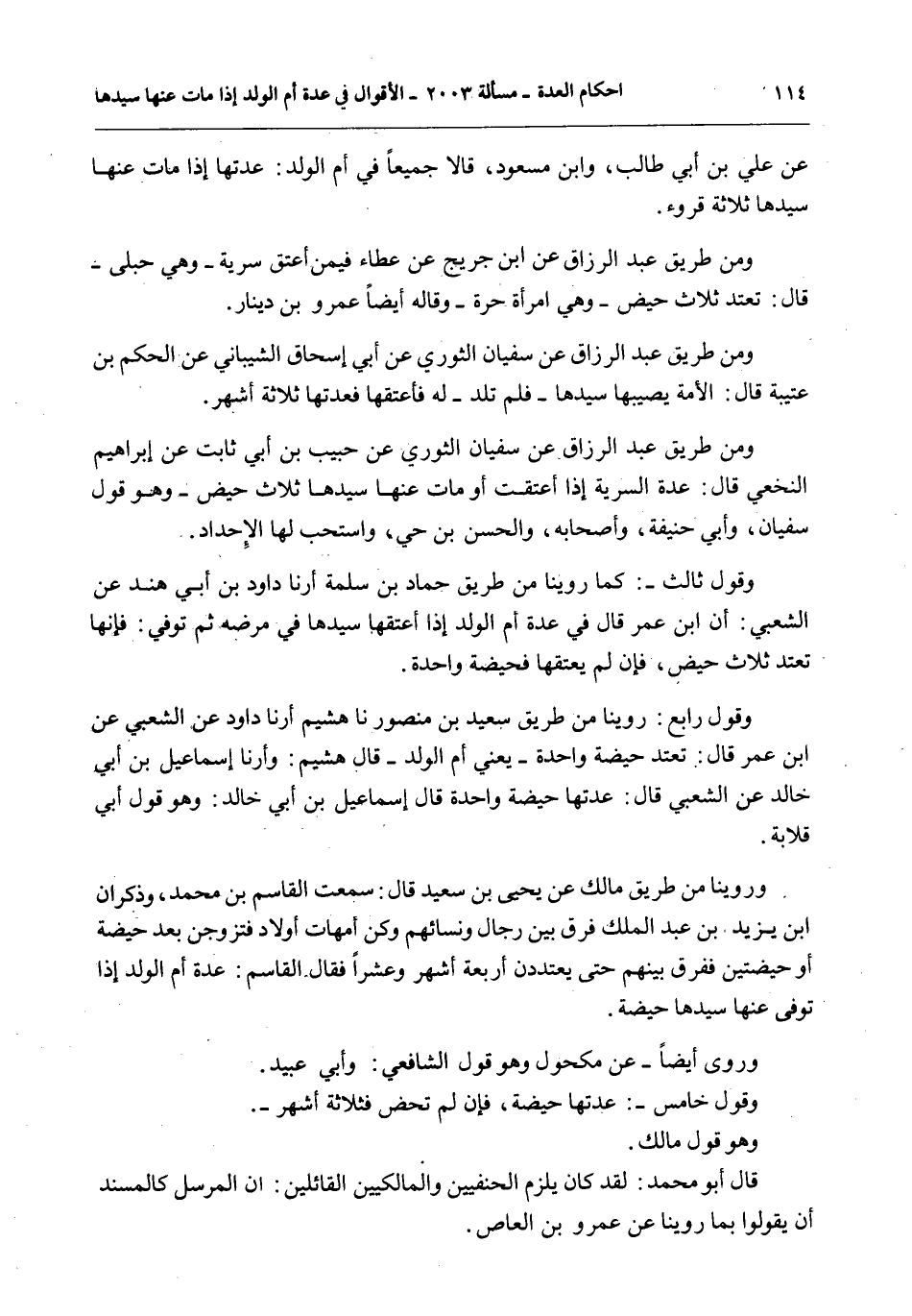 وَقَوْلٌ رَابِعٌ: رُوِّينَا مِنْ طَرِيقِ سَعِيدِ بْنِ مَنْصُورٍ أَنَا هُشَيْمٌ أَنَا دَاوُد عَنْ الشَّعْبِيِّ عَنْ ابْنِ عُمَرَ قَالَ: تَعْتَدُّ حَيْضَةً وَاحِدَةً - يَعْنِي أُمَّ الْوَلَدِ - قَالَ هُشَيْمٌ: وَأَنَا إسْمَاعِيلُ بْنُ أَبِي خَالِدٍ عَنْ الشَّعْبِيِّ قَالَ: عِدَّتُهَا حَيْضَةٌ وَاحِدَةٌ قَالَ إسْمَاعِيلُ بْنُ أَبِي خَالِدٍ: وَهُوَ قَوْلُ أَبِي قِلَابَةَ.
