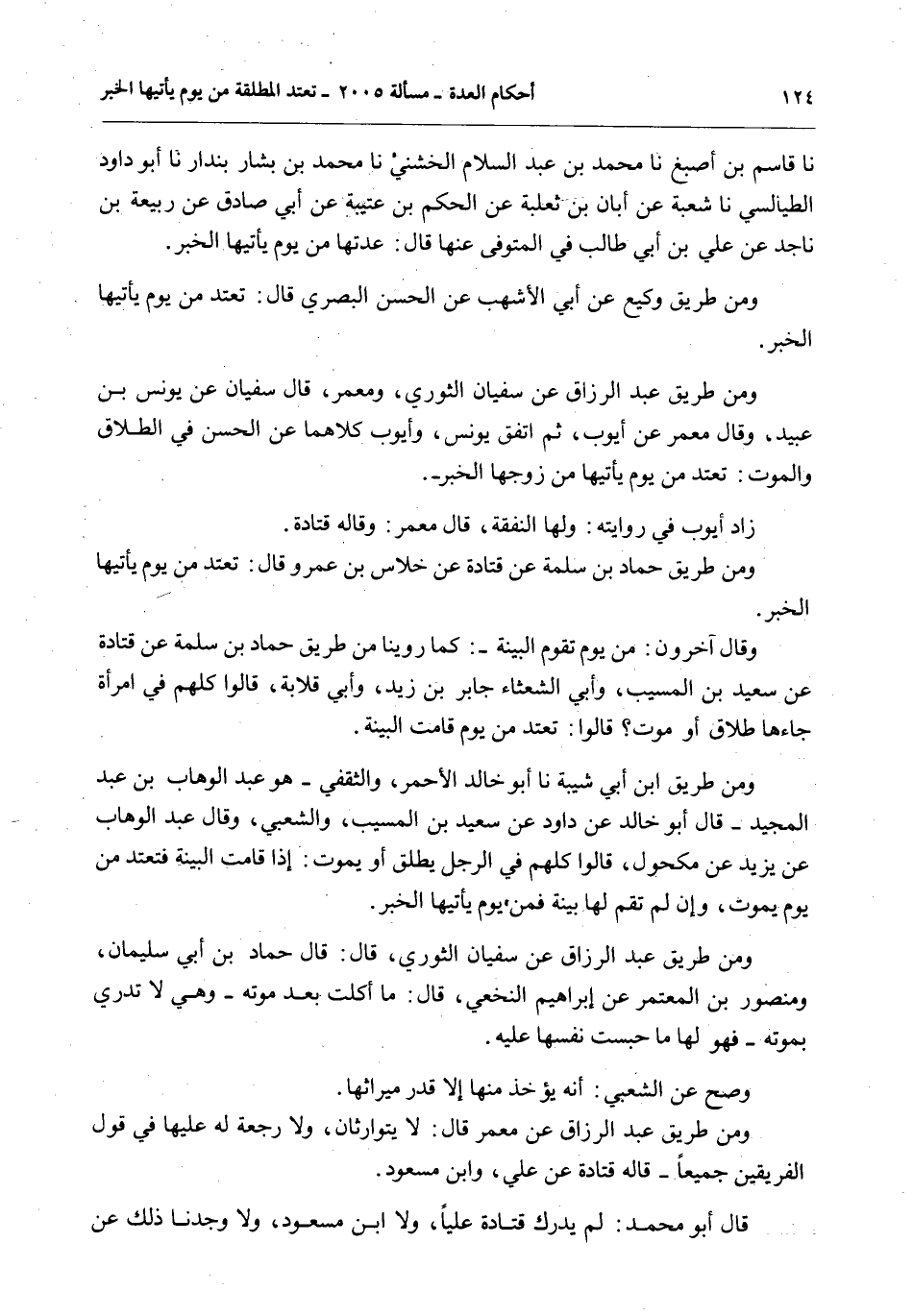 وَمِنْ طَرِيقِ عَبْدِ الرَّزَّاقِ عَنْ سُفْيَانَ الثَّوْرِيِّ، وَمَعْمَرٍ، قَالَ سُفْيَانُ عَنْ يُونُسَ بْنِ عُبَيْدٍ، وَقَالَ مَعْمَرٌ عَنْ أَيُّوبَ، ثُمَّ اتَّفَقَ يُونُسُ، وَأَيُّوبُ كِلَاهُمَا عَنْ الْحَسَنِ فِي الطَّلَاقِ وَالْمَوْتِ: تَعْتَدُّ مِنْ يَوْمِ يَأْتِيهَا مِنْ زَوْجِهَا الْخَبَرُ -.