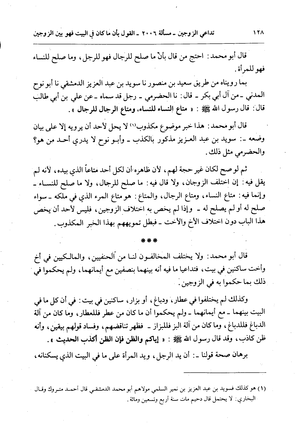 ثُمَّ لَوْ صَحَّ لَكَانَ غَيْرَ حُجَّةٍ لَهُمْ؛ لِأَنَّ ظَاهِرَهُ أَنَّ لِكُلِّ أَحَدٍ مَتَاعًا الَّذِي بِيَدِهِ؛ لِأَنَّهُ لَمْ يَقُلْ فِيهِ: إنْ اخْتَلَفَ الزَّوْجَانِ، وَلَا قَالَ فِيهِ: مَا صَلُحَ لِلرِّجَالِ، وَلَا مَا صَلُحَ لِلنِّسَاءِ - وَإِنَّمَا فِيهِ: مَتَاعُ النِّسَاءِ، وَمَتَاعُ الرِّجَالِ، وَالْمَتَاعُ: هُوَ مَتَاعُ الْمَرْءِ الَّذِي فِي مِلْكِهِ - سَوَاءٌ صَلُحَ لَهُ أَوْ لَمْ يَصْلُحْ لَهُ - وَإِذَا لَمْ يَخُصَّ بِهِ اخْتِلَافَ الزَّوْجَيْنِ، فَلَيْسَ لِأَحَدٍ أَنْ يَخُصَّ هَذَا الْبَابَ دُونَ اخْتِلَافِ الْأَخِ وَالْأُخْتِ - فَبَطَلَ تَمْوِيهُهُمْ بِهَذَا الْخَبَرِ الْمَكْذُوبِ.