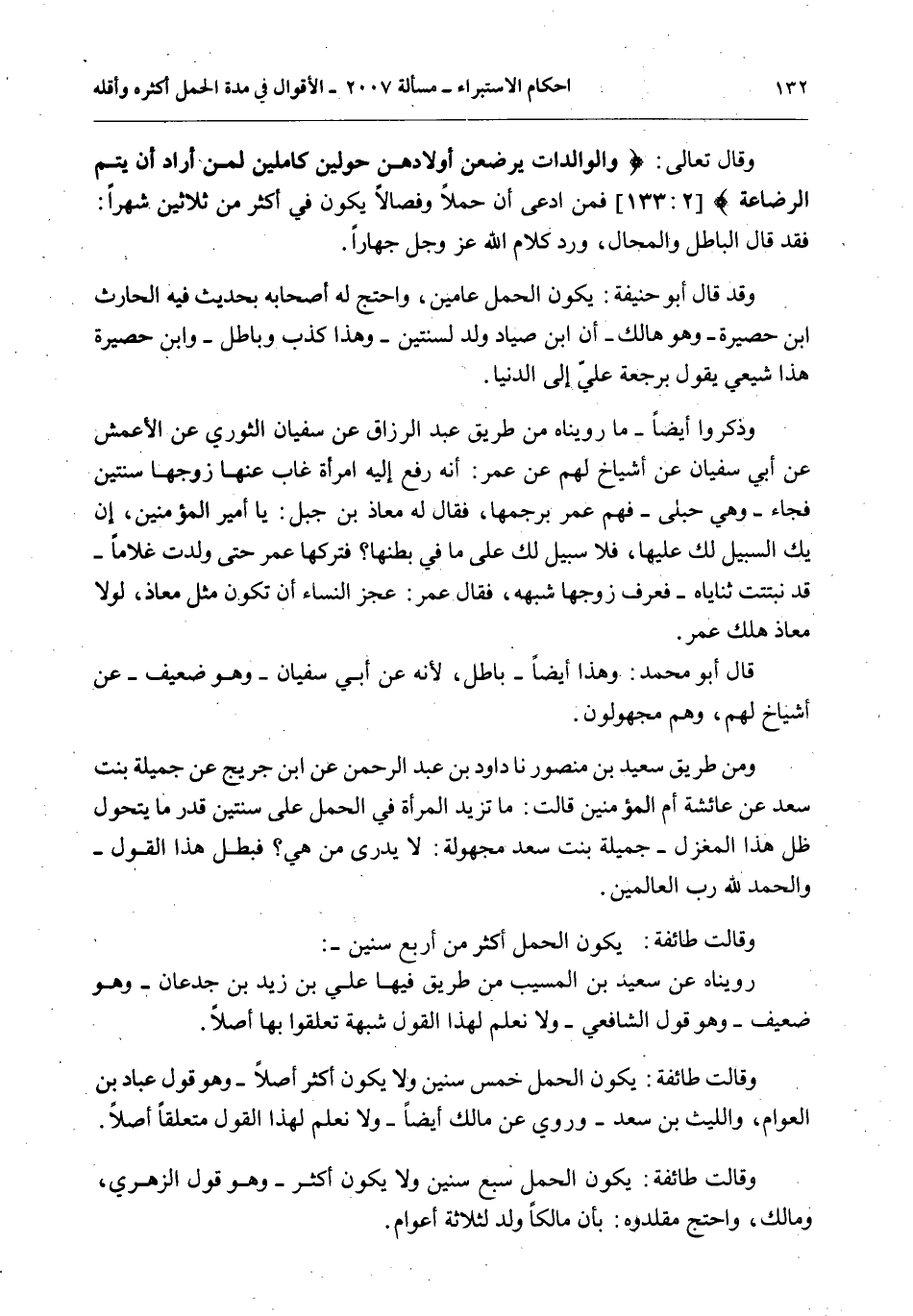 وَقَالَ تَعَالَى: {وَالْوَالِدَاتُ يُرْضِعْنَ أَوْلادَهُنَّ حَوْلَيْنِ كَامِلَيْنِ لِمَنْ أَرَادَ أَنْ يُتِمَّ الرَّضَاعَةَ} [البقرة: 233] فَمَنْ ادَّعَى أَنَّ حَمْلًا وَفِصَالًا يَكُونُ فِي أَكْثَرَ مِنْ ثَلَاثِينَ شَهْرًا: فَقَدْ قَالَ الْبَاطِلَ وَالْمُحَالَ، وَرَدَّ كَلَامَ اللَّهِ عَزَّ وَجَلَّ جِهَارًا.