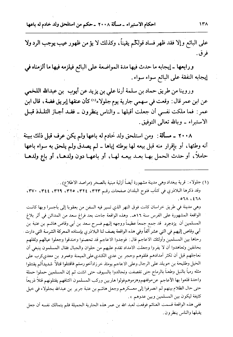 وَرُوِّينَا مِنْ طَرِيقِ حَمَّادِ بْنِ سَلَمَةَ أَنَا عَلِيُّ بْنُ يَزِيدَ عَنْ أَيُّوبَ بْنِ عَبْدِ اللَّهِ اللَّخْمِيِّ عَنْ ابْنِ عُمَرَ قَالَ: وَقَعَتْ فِي سَهْمِي جَارِيَةٌ يَوْمَ جَلُولَاءَ كَأَنَّ عُنُقَهَا إبْرِيقُ فِضَّةٍ، قَالَ ابْنُ عُمَرَ: فَمَا مَلَكْت نَفْسِي أَنْ جَعَلْت أُقَبِّلُهَا - وَالنَّاسُ يَنْظُرُونَ - فَقَدْ أَجَازَ التَّلَذُّذَ قَبْلَ الِاسْتِبْرَاءِ - وَبِاَللَّهِ تَعَالَى التَّوْفِيقُ.