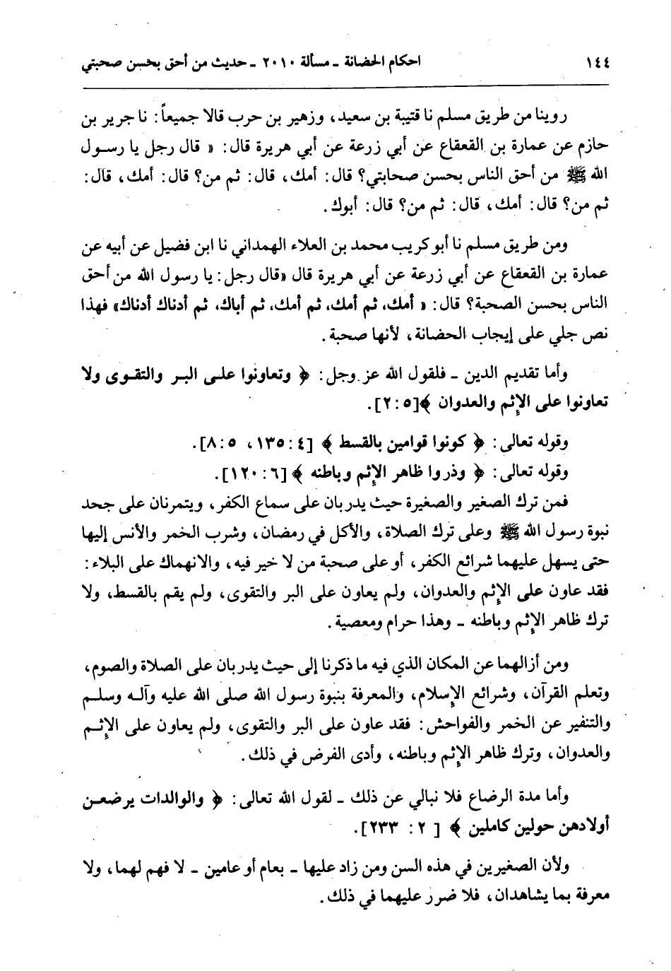 وَمِنْ طَرِيقِ مُسْلِمٍ أَنَا أَبُو كُرَيْبٍ مُحَمَّدُ بْنُ الْعَلَاءِ الْهَمْدَانِيُّ أَنَا ابْنُ فُضَيْلٍ عَنْ أَبِيهِ عَنْ عُمَارَةَ بْنِ الْقَعْقَاعِ عَنْ أَبِي زُرْعَةَ عَنْ أَبِي هُرَيْرَةَ قَالَ «قَالَ رَجُلٌ: يَا رَسُولَ اللَّهِ مَنْ أَحَقُّ النَّاسِ بِحُسْنِ الصُّحْبَةِ؟ قَالَ: أُمُّكَ ثُمَّ أُمُّكَ ثُمَّ أُمُّكَ ثُمَّ أَبَاكَ ثُمَّ أَدْنَاكَ أَدْنَاكَ» فَهَذَا نَصٌّ جَلِيٌّ عَلَى إيجَابِ الْحَضَانَةِ؛ لِأَنَّهَا صُحْبَةٌ.