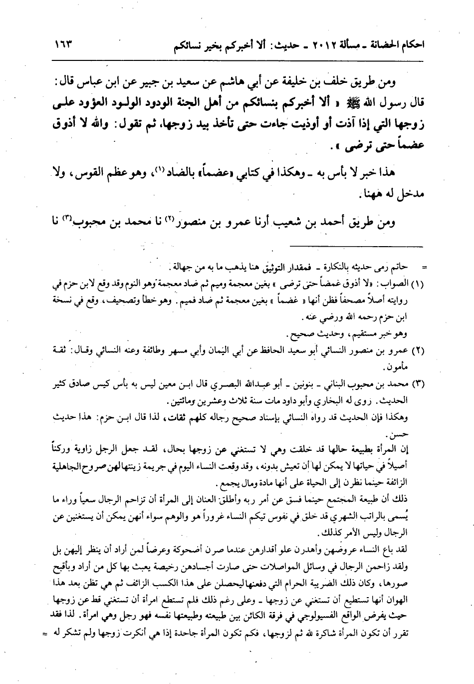 وَمِنْ طَرِيقِ خَلَفِ بْنِ خَلِيفَةَ عَنْ أَبِي هَاشِمٍ عَنْ سَعِيدِ بْنِ جُبَيْرٍ عَنْ ابْنِ عَبَّاسٍ قَالَ: قَالَ رَسُولُ اللَّهِ - صَلَّى اللَّهُ عَلَيْهِ وَسَلَّمَ - «أَلَا أُخْبِرُكُمْ بِنِسَائِكُمْ مِنْ أَهْلِ الْجَنَّةِ الْوَدُودُ الْوَلُودُ الْعَئُودُ عَلَى زَوْجِهَا الَّتِي إذَا آذَتْ أَوْ أُوذِيَتْ جَاءَتْ حَتَّى تَأْخُذَ بِيَدِ زَوْجِهَا، ثُمَّ تَقُولُ: وَاَللَّهِ لَا أَذُوقُ عَضْمًا حَتَّى تَرْضَى» .