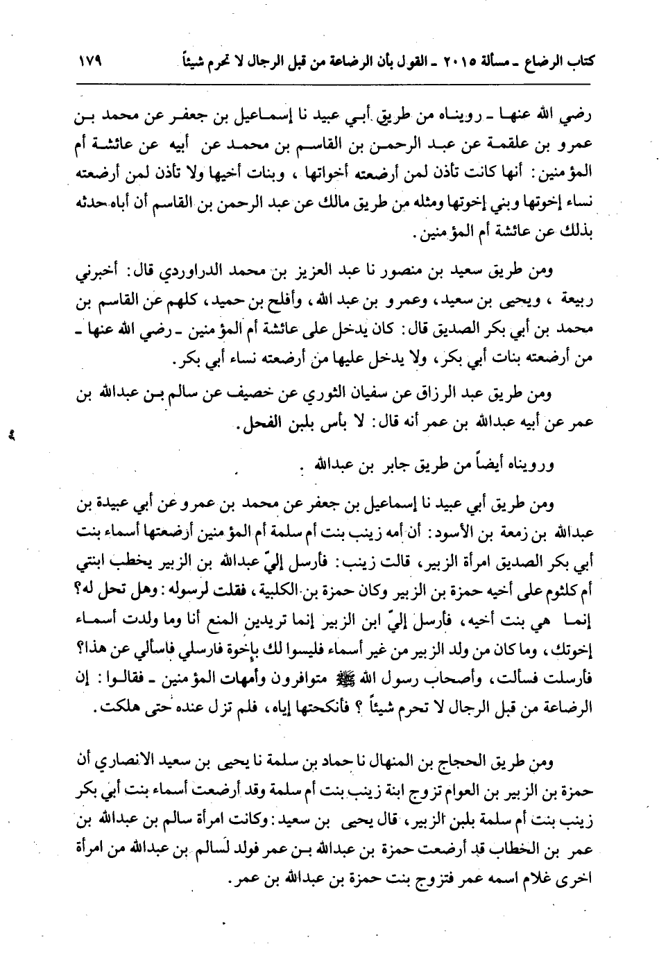 - رَضِيَ اللَّهُ عَنْهَا - رُوِّينَاهُ مِنْ طَرِيق أَبِي عُبَيْدٍ أَنَا إسْمَاعِيلُ بْنُ جَعْفَرٍ عَنْ مُحَمَّدِ بْنِ عَمْرِو بْنِ عَلْقَمَةَ عَنْ عَبْدِ الرَّحْمَنِ بْنِ الْقَاسِمِ بْنِ مُحَمَّدٍ عَنْ أَبِيهِ عَنْ عَائِشَةَ أُمِّ الْمُؤْمِنِينَ: أَنَّهَا كَانَتْ تَأْذَنُ لِمَنْ أَرْضَعَتْهُ أَخَوَاتُهَا، وَبَنَاتُ أَخِيهَا وَلَا تَأْذَنُ لِمَنْ أَرْضَعَتْهُ نِسَاءُ إخْوَتِهَا وَبَنِي إخْوَتِهَا وَمِثْلُهُ مِنْ طَرِيقِ مَالِكٍ عَنْ عَبْدِ الرَّحْمَنِ بْنِ الْقَاسِمِ أَنَّ أَبَاهُ حَدَّثَهُ بِذَلِكَ عَنْ عَائِشَةَ أُمِّ الْمُؤْمِنِينَ.