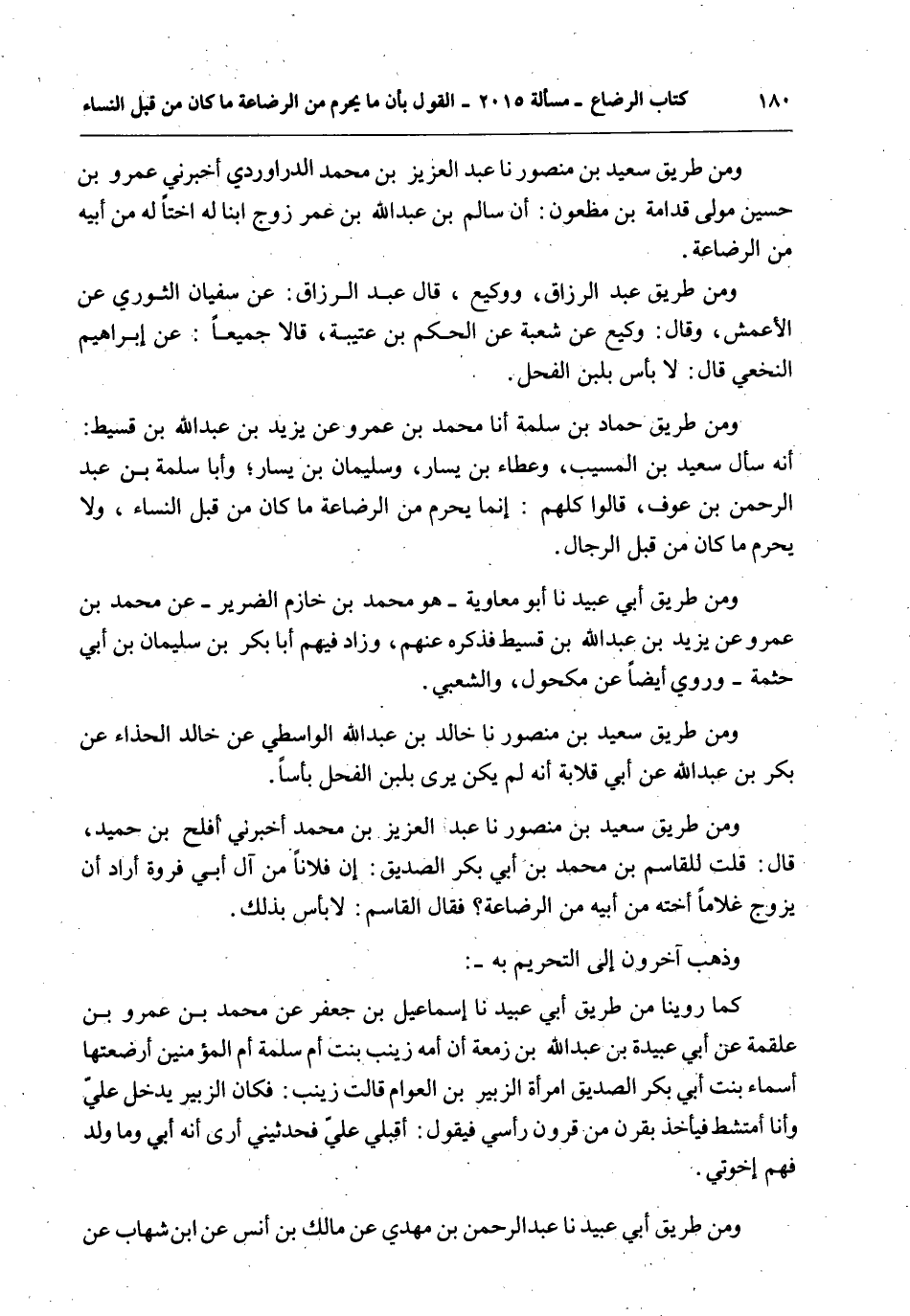 وَمِنْ طَرِيقِ سَعِيدِ بْنِ مَنْصُورٍ أَنَا عَبْدُ الْعَزِيزِ بْنُ مُحَمَّدٍ أَخْبَرَنِي أَفْلَحُ بْنُ حُمَيْدٍ، قَالَ: قُلْت لِلْقَاسِمِ بْنِ مُحَمَّدِ بْنِ أَبِي بَكْرٍ الصِّدِّيقِ: إنَّ فُلَانًا مِنْ آلِ أَبِي فَرْوَةَ أَرَادَ أَنْ يُزَوِّجَ غُلَامًا أُخْتَهُ مِنْ أَبِيهِ مِنْ الرَّضَاعَةِ؟ فَقَالَ الْقَاسِمُ: لَا بَأْسَ بِذَلِكَ.