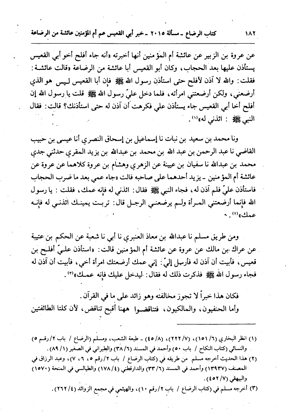 عَنْ عُرْوَةَ بْنِ الزُّبَيْرِ «عَنْ عَائِشَةَ أُمِّ الْمُؤْمِنِينَ أَنَّهَا أَخْبَرَتْهُ أَنَّهُ جَاءَ أَفْلَحُ أَخُو أَبِي الْقُعَيْسِ يَسْتَأْذِنُ عَلَيْهَا بَعْدَ الْحِجَابِ، وَكَانَ أَبُو الْقُعَيْسِ أَبَا عَائِشَةَ مِنْ الرَّضَاعَةِ قَالَتْ عَائِشَةُ: فَقُلْت: وَاَللَّهِ لَا آذَنُ لِأَفْلَحَ حَتَّى أَسْتَأْذِنَ رَسُولَ اللَّهِ - صَلَّى اللَّهُ عَلَيْهِ وَسَلَّمَ - فَإِنَّ أَبَا الْقُعَيْسِ لَيْسَ هُوَ الَّذِي أَرْضَعَنِي، وَلَكِنْ أَرْضَعَتْنِي امْرَأَتُهُ، فَلَمَّا دَخَلَ عَلَيَّ رَسُولُ اللَّهِ - صَلَّى اللَّهُ عَلَيْهِ وَسَلَّمَ - قُلْتُ يَا رَسُولَ اللَّهِ إنَّ أَفْلَحَ أَخَا أَبِي الْقُعَيْسِ جَاءَ يَسْتَأْذِنُ عَلَيَّ فَكَرِهْتُ أَنْ آذَنَ حَتَّى أَسْتَأْذِنَكَ؟ قَالَتْ: فَقَالَ النَّبِيُّ - صَلَّى اللَّهُ عَلَيْهِ وَسَلَّمَ -: ائْذَنِي لَهُ» .