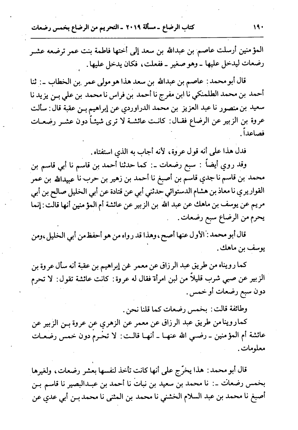 كَمَا رُوِّينَا مِنْ طَرِيقِ عَبْدِ الرَّزَّاقِ عَنْ مَعْمَرٍ عَنْ الزُّهْرِيِّ عَنْ عُرْوَةَ بْنِ الزُّبَيْرِ عَنْ عَائِشَةَ أُمِّ الْمُؤْمِنِينَ - رَضِيَ اللَّهُ عَنْهَا - أَنَّهَا قَالَتْ: لَا تُحَرِّمُ دُونَ خَمْسِ رَضَعَاتٍ مَعْلُومَاتٍ. قَالَ أَبُو مُحَمَّدٍ: هَذَا يَخْرُجُ عَلَى أَنَّهَا كَمَا كَانَتْ تَأْخُذُ لِنَفْسِهَا بِعَشْرِ رَضَعَاتٍ، وَلِغَيْرِهَا بِخَمْسِ رَضَعَاتٍ -: أَنَا مُحَمَّدُ بْنُ سَعِيدِ بْنِ نُبَاتٍ أَنَا أَحْمَدُ بْنُ عَبْدِ الْبَصِيرِ أَنَا قَاسِمُ بْنُ أَصْبَغَ أَنَا مُحَمَّدُ بْنُ عَبْدِ السَّلَامِ الْخُشَنِيُّ أَنَا مُحَمَّدُ بْنُ الْمُثَنَّى أَنَا مُحَمَّدُ بْنُ أَبِي عَدِيٍّ عَنْ