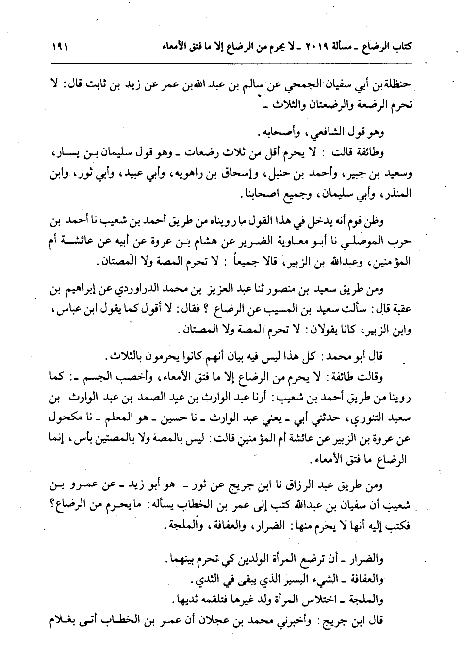 وَمِنْ طَرِيقِ عَبْدِ الرَّزَّاقِ أَنَا ابْنُ جُرَيْجٍ عَنْ ثَوْرٍ - هُوَ أَبُو زَيْدٍ - عَنْ عَمْرِو بْنِ شُعَيْبٍ أَنَّ سُفْيَانَ بْنِ عَبْدِ اللَّهِ كَتَبَ إلَى عُمَرَ بْنِ الْخَطَّابِ يَسْأَلُهُ: مَا يُحَرِّمُ مِنْ الرَّضَاعِ؟ فَكَتَبَ إلَيْهِ أَنَّهُ لَا يُحَرِّمُ مِنْهَا: الضِّرَارُ، وَالْعُفَافَةُ وَالْمَلْجَةُ.