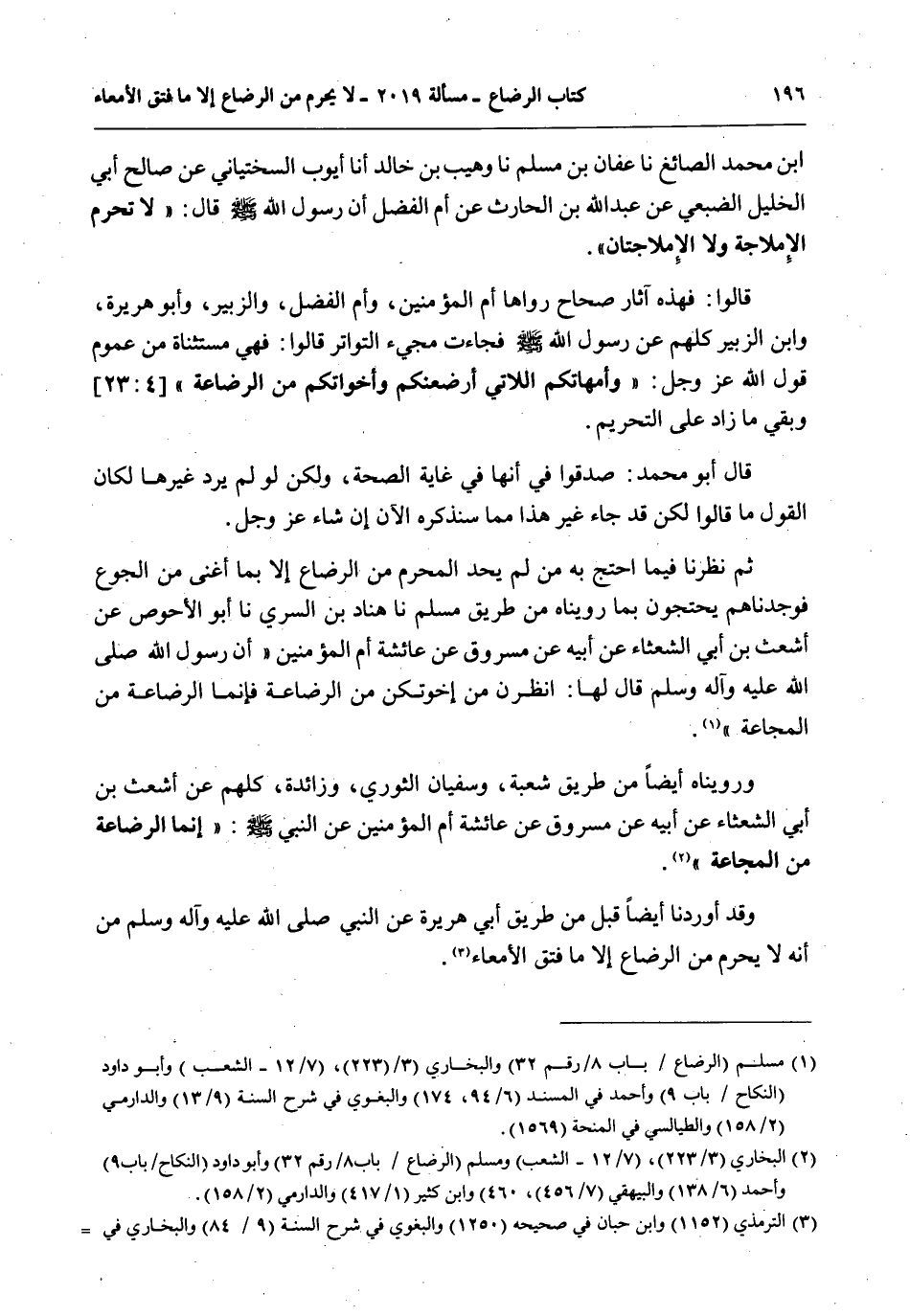 ثُمَّ نَظَرْنَا فِيمَا احْتَجَّ بِهِ مَنْ لَمْ يُحِدَّ الْمُحَرِّمُ مِنْ الرَّضَاعِ إلَّا بِمَا أَغْنَى مِنْ الْجُوعِ فَوَجَدْنَاهُمْ يَحْتَجُّونَ بِمَا رُوِّينَاهُ مِنْ طَرِيقِ مُسْلِمٍ أَنَا هَنَّادُ بْنُ السَّرِيِّ أَنَا أَبُو الْأَحْوَصِ عَنْ أَشْعَثَ بْنِ أَبِي الشَّعْثَاءِ عَنْ أَبِيهِ عَنْ مَسْرُوقٍ عَنْ عَائِشَةَ أُمِّ الْمُؤْمِنِينَ «أَنَّ رَسُولَ اللَّهِ - صَلَّى اللَّهُ عَلَيْهِ وَآلِهِ وَسَلَّمَ - قَالَ لَهَا: اُنْظُرْنَ مِنْ إخْوَتِكُنَّ مِنْ الرَّضَاعَةِ فَإِنَّمَا الرَّضَاعَةُ مِنْ الْمَجَاعَةِ» .