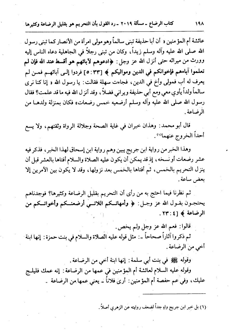 ثُمَّ نَظَرْنَا فِيمَا احْتَجَّ بِهِ مَنْ رَأَى أَنَّ التَّحْرِيمَ بِقَلِيلِ الرَّضَاعَةِ وَكَثِيرِهَا؟ فَوَجَدْنَاهُمْ يَحْتَجُّونَ بِقَوْلِ اللَّهِ عَزَّ وَجَلَّ: {وَأُمَّهَاتُكُمُ اللاتِي أَرْضَعْنَكُمْ وَأَخَوَاتُكُمْ مِنَ الرَّضَاعَةِ} [النساء: 23] قَالُوا: فَعَمَّ اللَّهُ عَزَّ وَجَلَّ وَلَمْ يَخُصَّ.
