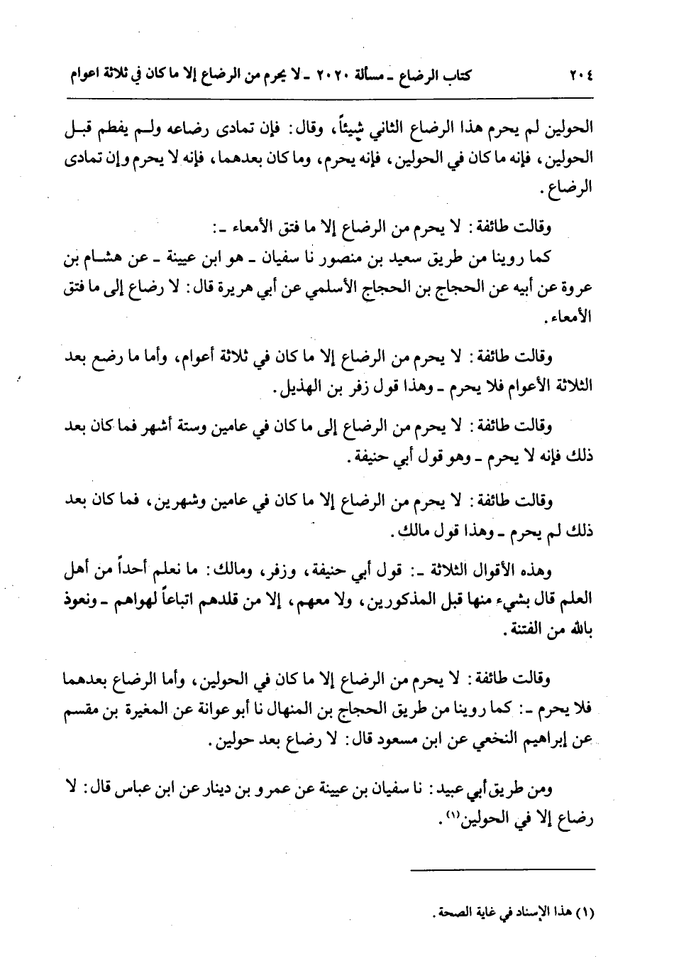 وَقَالَتْ طَائِفَةٌ: لَا يُحَرِّمُ مِنْ الرَّضَاعِ إلَّا مَا كَانَ فِي الْحَوْلَيْنِ، وَأَمَّا الرَّضَاعُ بَعْدَهُمَا فَلَا يُحَرِّمُ -: كَمَا رُوِّينَا مِنْ طَرِيقِ الْحَجَّاجِ بْنِ الْمِنْهَالِ أَنَا أَبُو عَوَانَةَ عَنْ الْمُغِيرَةِ بْنِ مِقْسَمٍ عَنْ إبْرَاهِيمَ النَّخَعِيِّ عَنْ ابْنِ مَسْعُودٍ قَالَ: لَا رَضَاعَ بَعْدَ حَوْلَيْنِ. وَمِنْ طَرِيقِ أَبِي عُبَيْدٍ: أَنَا سُفْيَانُ بْنُ عُيَيْنَةَ عَنْ عَمْرِو بْنِ دِينَارٍ عَنْ ابْنِ عَبَّاسٍ قَالَ: لَا رَضَاعَ إلَّا فِي الْحَوْلَيْنِ.