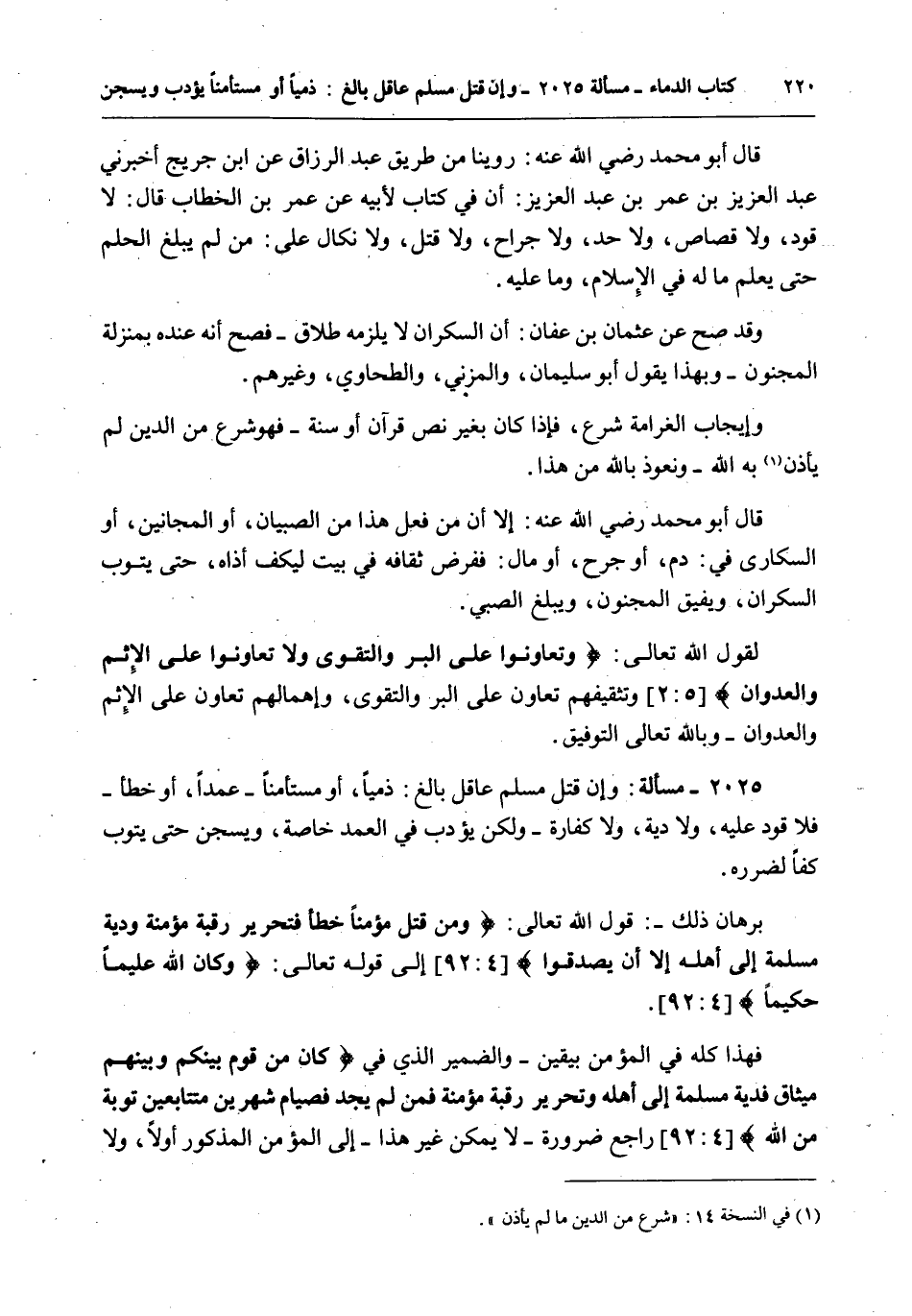 2025 - مَسْأَلَةٌ: وَإِنْ قَتَلَ مُسْلِمٌ عَاقِلٌ بَالِغٌ: ذِمِّيًّا، أَوْ مُسْتَأْمَنًا - عَمْدًا، أَوْ خَطَأً - فَلَا قَوَدَ عَلَيْهِ، وَلَا دِيَةَ، وَلَا كَفَّارَةَ - وَلَكِنْ يُؤَدَّبُ فِي الْعَمْدِ خَاصَّةً، وَيُسْجَنُ حَتَّى يَتُوبَ كَفًّا لِضَرَرِهِ.
