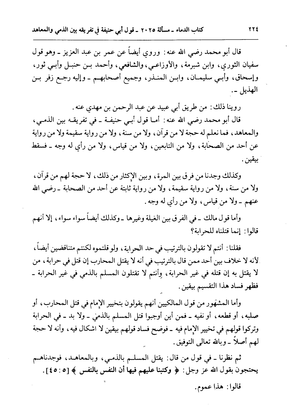 ثُمَّ نَظَرْنَا - فِي قَوْلِ مَنْ قَالَ: يُقْتَلُ الْمُسْلِمُ بِالذِّمِّيِّ، وَبِالْمُعَاهَدِ، فَوَجَدْنَاهُمْ يَحْتَجُّونَ بِقَوْلِ اللَّهِ عَزَّ وَجَلَّ: {وَكَتَبْنَا عَلَيْهِمْ فِيهَا أَنَّ النَّفْسَ بِالنَّفْسِ} [المائدة: 45] قَالُوا: هَذَا عُمُومٌ.