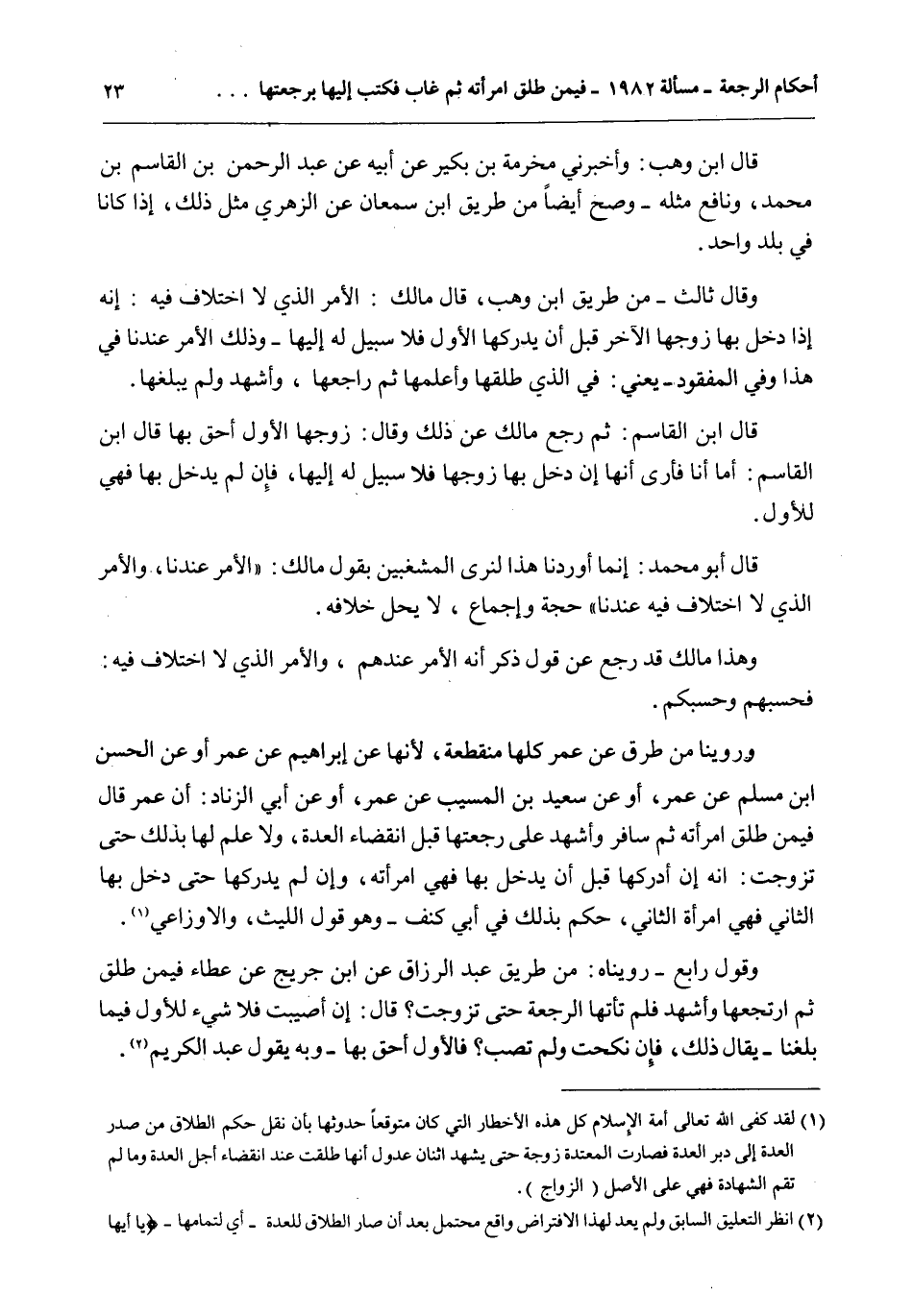 قَالَ ابْنُ وَهْبٍ: وَأَخْبَرَنِي مَخْرَمَةُ بْنُ بُكَيْرٍ عَنْ أَبِيهِ عَنْ عَبْدِ الرَّحْمَنِ بْنِ الْقَاسِمِ بْنِ مُحَمَّدٍ، وَنَافِعٍ مِثْلُهُ - وَصَحَّ أَيْضًا مِنْ طَرِيقِ ابْنِ سَمْعَانَ عَنْ الزُّهْرِيِّ مِثْلُ ذَلِكَ، إذَا كَانَا فِي بَلَدٍ وَاحِدٍ. وَقَالَ ثَالِثٌ - مِنْ طَرِيقِ ابْنِ وَهْبٍ، قَالَ مَالِكٌ: الْأَمْرُ لِي لَا اخْتِلَافَ فِيهِ: إنَّهُ إذَا دَخَلَ بِهَا زَوْجُهَا الْآخَرُ قَبْلَ أَنْ يُدْرِكَهَا الْأَوَّلُ فَلَا سَبِيلَ لَهُ إلَيْهَا - وَذَلِكَ الْأَمْرُ عِنْدَنَا فِي هَذَا وَفِي الْمَفْقُودِ - يَعْنِي: فِي الَّذِي طَلَّقَهَا وَأَعْلَمَهَا ثُمَّ رَاجَعَهَا وَأَشْهَدَ وَلَمْ يُبْلِغْهَا.