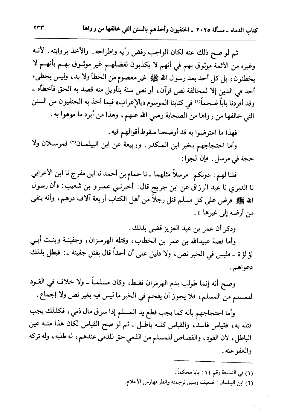 فَإِنْ لَجُّوا: قُلْنَا لَهُمْ: دُونَكُمْ مُرْسَلًا مِثْلَهُمَا - أَنَا حُمَامُ بْنُ أَحْمَدَ أَنَا ابْنُ مُفَرِّجٍ أَنَا ابْنُ الْأَعْرَابِيِّ أَنَا الدَّبَرِيُّ أَنَا عَبْدُ الرَّزَّاقِ عَنْ ابْنِ جُرَيْجٍ قَالَ: أَخْبَرَنِي عَمْرُو بْنُ شُعَيْبٍ: «أَنَّ رَسُولَ اللَّهِ - صَلَّى اللَّهُ عَلَيْهِ وَسَلَّمَ - فَرَضَ عَلَى كُلِّ مُسْلِمٍ قَتَلَ رَجُلًا مِنْ أَهْلِ الْكِتَابِ أَرْبَعَةَ آلَافِ دِرْهَمٍ، وَأَنَّهُ يُنْفَى مِنْ أَرْضِهِ إلَى غَيْرِهَا» .