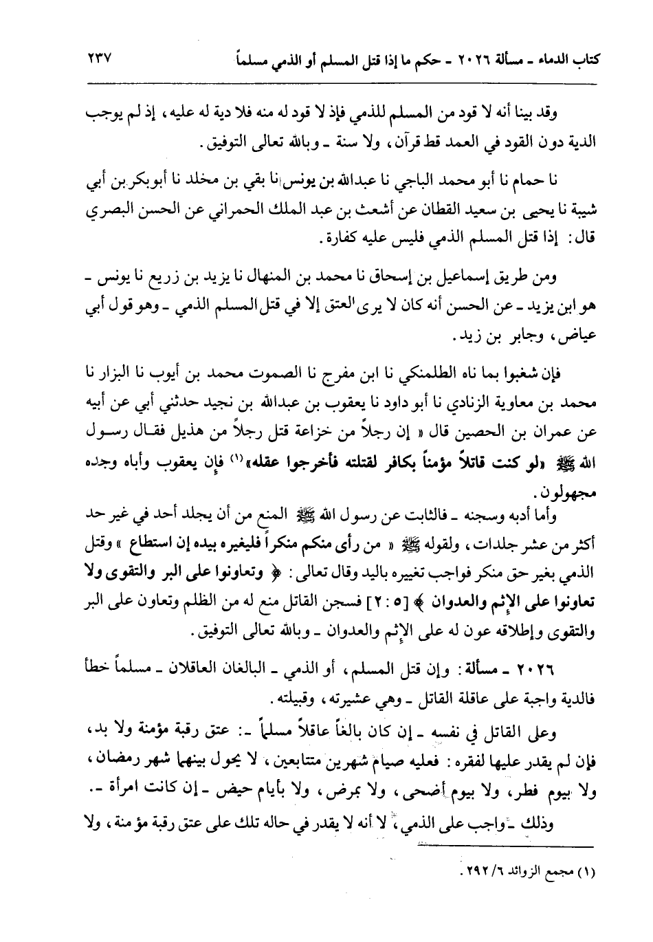 وَمِنْ طَرِيقِ إسْمَاعِيلَ بْنِ إِسْحَاقَ أَنَا مُحَمَّدُ بْنُ الْمِنْهَالِ أَنَا يَزِيدُ بْنُ زُرَيْعٍ أَنَا يُونُسُ - هُوَ ابْنُ يَزِيدَ - عَنْ الْحَسَنِ أَنَّهُ كَانَ لَا يَرَى الْعِتْقَ إلَّا فِي قَتْلِ الْمُسْلِمِ الذِّمِّيَّ - وَهُوَ قَوْلُ أَبِي عِيَاضٍ، وَجَابِرِ بْنِ زَيْدٍ. فَإِنْ شَغَبُوا بِمَا نَاهَ الطَّلْمَنْكِيُّ أَنَا ابْنُ مُفَرِّجٍ أَنَا الصَّمُوتُ مُحَمَّدُ بْنُ أَيُّوبَ أَنَا الْبَزَّارُ أَنَا مُحَمَّدُ بْنُ مُعَاوِيَةَ الزَّنَادِيُّ أَنَا أَبُو دَاوُد أَنَا يَعْقُوبُ بْنُ عَبْدِ اللَّهِ بْنِ نُجَيْدٍ حَدَّثَنِي أَبِي عَنْ أَبِيهِ عَنْ عِمْرَانَ بْنِ الْحُصَيْنِ قَالَ «إنَّ رَجُلًا مِنْ خُزَاعَةَ قَتَلَ رَجُلًا مِنْ هُذَيْلٍ فَقَالَ رَسُولُ اللَّهِ - صَلَّى اللَّهُ عَلَيْهِ وَسَلَّمَ - لَوْ كُنْتُ قَاتِلًا مُؤْمِنًا بِكَافِرٍ لَقَتَلْتُهُ فَأَخْرِجُوا عَقْلَهُ» فَإِنَّ يَعْقُوبَ وَأَبَاهُ وَجَدَّهُ مَجْهُولُونَ.