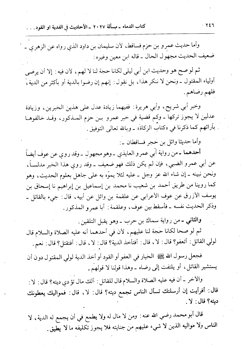 وَأَمَّا حَدِيثُ عَمْرِو بْنِ حَزْمٍ فَسَاقِطٌ؛ لِأَنَّ سُلَيْمَانَ بْنَ دَاوُد الَّذِي رَوَاهُ عَنْ الزُّهْرِيِّ - ضَعِيفُ الْحَدِيثِ مَجْهُولُ الْحَالِ - قَالَ ابْنُ مَعِينٍ وَغَيْرُهُ: ثُمَّ لَوْ صَحَّ هُوَ وَحَدِيثُ ابْنِ أَبِي لَيْلَى لَكَانَا حُجَّةً لَنَا لَا لَهُمْ؛ لِأَنَّ فِيهِ: إلَّا أَنْ يَرْضَى أَوْلِيَاءُ الْمَقْتُولِ - وَنَحْنُ لَا نُنْكِرُ هَذَا، بَلْ نَقُولُ: إنَّهُمْ إنْ رَضُوا بِالدِّيَةِ أَوْ بِأَكْثَرَ مِنْ الدِّيَةِ، فَلَهُمْ رِضَاهُمْ.