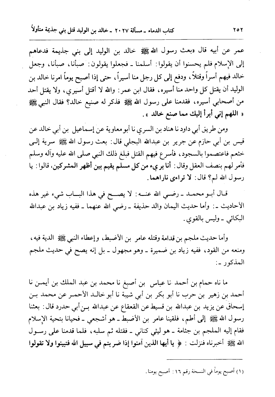 قَالَ «بَعَثَ رَسُولُ اللَّهِ - صَلَّى اللَّهُ عَلَيْهِ وَسَلَّمَ - خَالِدَ بْنَ الْوَلِيدِ إلَى بَنِي جَذِيمَةَ فَدَعَاهُمْ إلَى الْإِسْلَامِ فَلَمْ يُحْسِنُوا أَنْ يَقُولُوا: أَسْلَمْنَا - فَجَعَلُوا يَقُولُونَ: صَبَأْنَا، صَبَأْنَا، وَجَعَلَ خَالِدٌ فِيهِمْ أَسْرًا وَقَتْلًا، وَدَفَعَ إلَى كُلِّ رَجُلٍ مِنَّا أَسِيرًا، حَتَّى إذَا أَصْبَحَ يَوْمًا أَمَرَنَا خَالِدُ بْنُ الْوَلِيدِ أَنْ يَقْتُلَ كُلُّ وَاحِدٍ مِنَّا أَسِيرَهُ، فَقَالَ ابْنُ عُمَرَ: وَاَللَّهِ لَا أَقْتُلُ أَسِيرِي، وَلَا يَقْتُلُ أَحَدٌ مِنْ أَصْحَابِي أَسِيرَهُ، فَقَدِمْنَا عَلَى رَسُولِ اللَّهِ - صَلَّى اللَّهُ عَلَيْهِ وَسَلَّمَ - فَذُكِرَ لَهُ صَنِيعُ خَالِدٍ؟ فَقَالَ النَّبِيُّ - صَلَّى اللَّهُ عَلَيْهِ وَسَلَّمَ - اللَّهُمَّ إنِّي أَبْرَأُ إلَيْكَ مِمَّا صَنَعَ خَالِدٌ» .