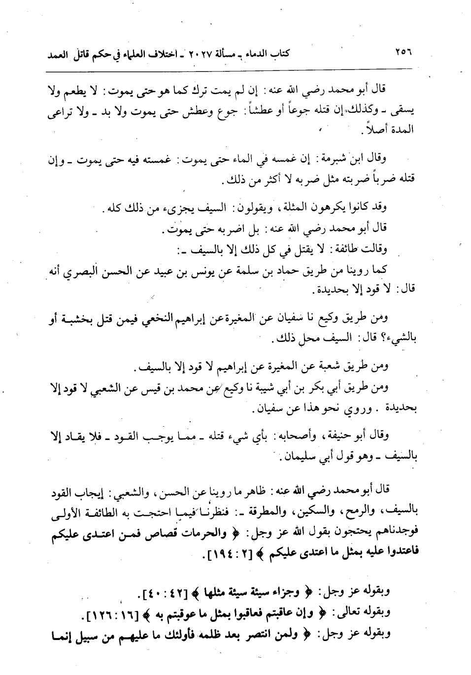 قَالَ أَبُو مُحَمَّدٍ - رَضِيَ اللَّهُ عَنْهُ -: ظَاهِرُ مَا رُوِّينَا عَنْ الْحَسَنِ، وَالشَّعْبِيِّ: إيجَابُ الْقَوَدِ بِالسَّيْفِ، وَالرُّمْحِ، وَالسِّكِّينِ، وَالْمِطْرَقَةِ -: فَنَظَرْنَا فِيمَا احْتَجَّتْ بِهِ الطَّائِفَةُ الْأُولَى فَوَجَدْنَاهُمْ يَحْتَجُّونَ بِقَوْلِ اللَّهِ عَزَّ وَجَلَّ: {وَالْحُرُمَاتُ قِصَاصٌ فَمَنِ اعْتَدَى عَلَيْكُمْ فَاعْتَدُوا عَلَيْهِ بِمِثْلِ مَا اعْتَدَى عَلَيْكُمْ} [البقرة: 194] .