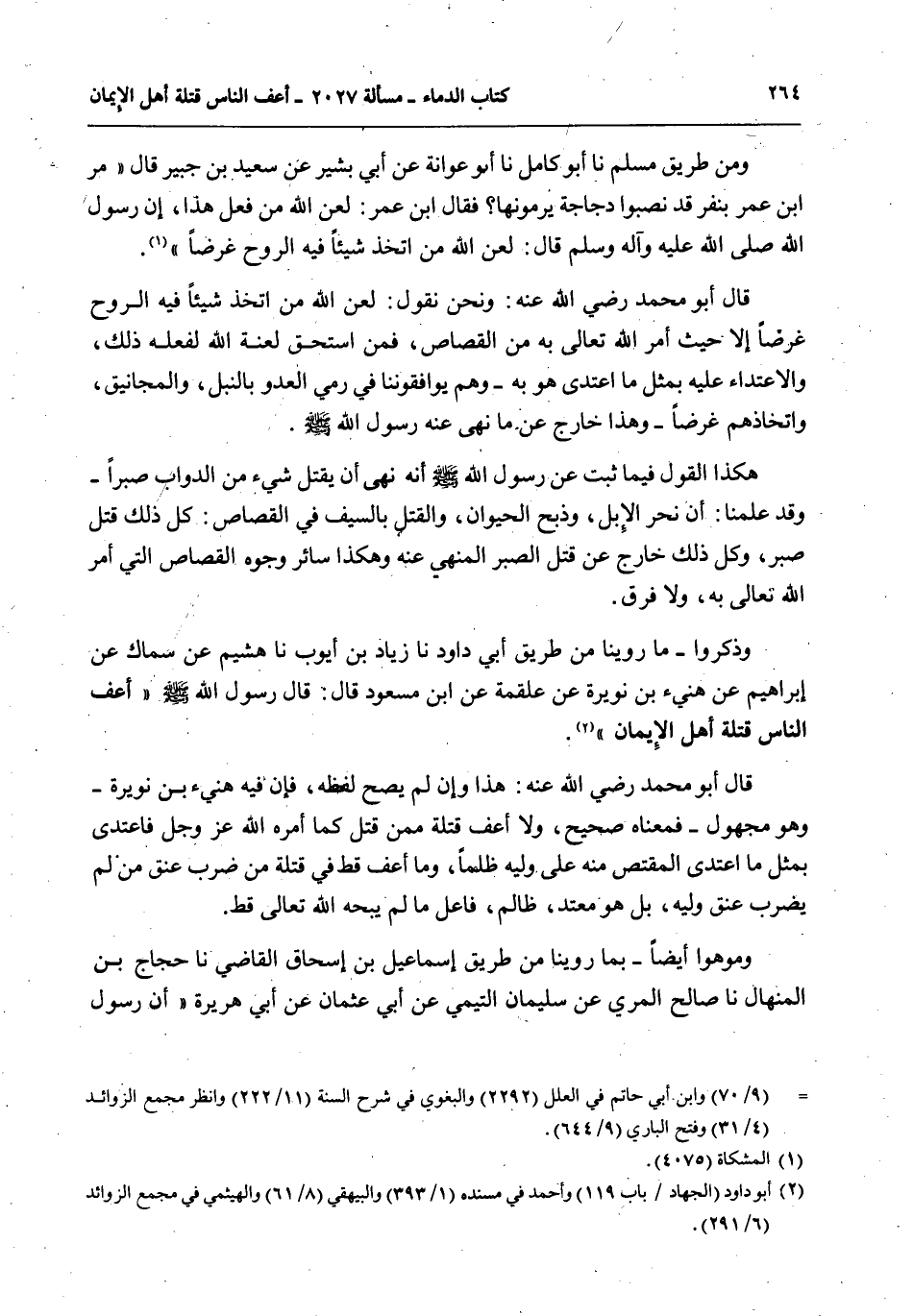 وَذَكَرُوا - مَا رُوِّينَا مِنْ طَرِيقِ أَبِي دَاوُد أَنَا زِيَادُ بْنُ أَيُّوبَ أَنَا هُشَيْمٌ عَنْ سِمَاكٍ عَنْ إبْرَاهِيمَ عَنْ هَنِيءِ بْنِ نُوَيْرَةَ عَنْ عَلْقَمَةَ عَنْ ابْنِ مَسْعُودٍ قَالَ: قَالَ رَسُولُ اللَّهِ - صَلَّى اللَّهُ عَلَيْهِ وَسَلَّمَ - «أَعَفُّ النَّاسِ قِتْلَةً أَهْلُ الْإِيمَانِ» .