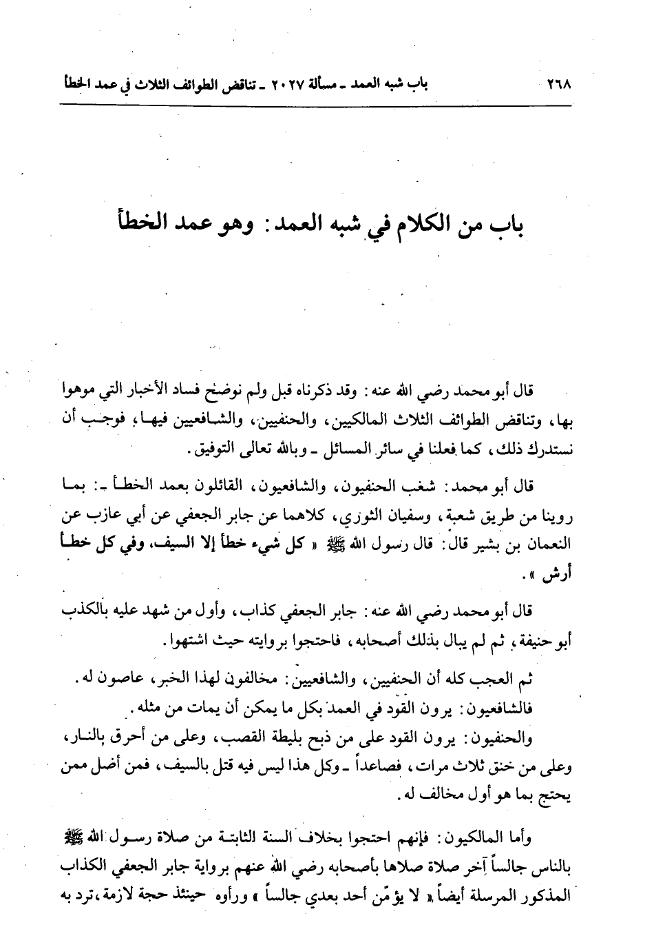 قَالَ أَبُو مُحَمَّدٍ: شَغَبَ الْحَنَفِيُّونَ، وَالشَّافِعِيُّونَ، الْقَائِلُونَ بِعَمْدِ الْخَطَأِ -: بِمَا رُوِّينَا مِنْ طَرِيقِ شُعْبَةَ، وَسُفْيَانَ الثَّوْرِيِّ، كِلَاهُمَا عَنْ جَابِرٍ الْجُعْفِيِّ عَنْ أَبِي عَازِبٍ عَنْ النُّعْمَانِ بْنِ بَشِيرٍ قَالَ: قَالَ رَسُولُ اللَّهِ - صَلَّى اللَّهُ عَلَيْهِ وَسَلَّمَ - «كُلُّ شَيْءٍ خَطَأٌ إلَّا السَّيْفَ، وَفِي كُلِّ خَطَأٍ أَرْشٌ» .