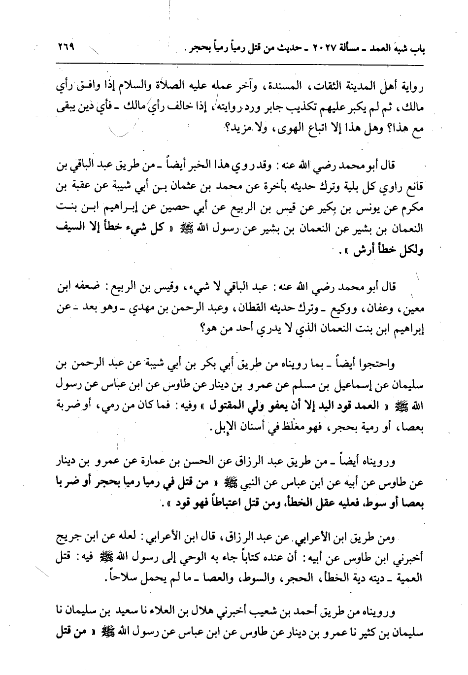 قَالَ أَبُو مُحَمَّدٍ - رَضِيَ اللَّهُ عَنْهُ -: عَبْدُ الْبَاقِي لَا شَيْءَ، وَقَيْسُ بْنُ الرَّبِيعِ: ضَعَّفَهُ ابْنُ مَعِينٍ، وَعَفَّانُ، وَوَكِيعٌ - وَتَرَكَ حَدِيثَهُ الْقَطَّانُ، وَعَبْدُ الرَّحْمَنِ بْنُ مَهْدِيٍّ - وَهُوَ بُعْدٌ - عَنْ إبْرَاهِيمَ بْنِ بِنْتِ النُّعْمَانِ الَّذِي لَا يَدْرِي أَحَدٌ مَنْ هُوَ؟ وَاحْتَجُّوا أَيْضًا - بِمَا رُوِّينَاهُ مِنْ طَرِيقِ أَبِي بَكْرِ بْنِ أَبِي شَيْبَةَ عَنْ عَبْدِ الرَّحْمَنِ بْنِ سُلَيْمَانَ عَنْ إسْمَاعِيلَ بْنِ مُسْلِمٍ عَنْ عَمْرِو بْنِ دِينَارٍ عَنْ طَاوُسٍ عَنْ ابْنِ عَبَّاسٍ عَنْ رَسُولِ اللَّهِ - صَلَّى اللَّهُ عَلَيْهِ وَسَلَّمَ - «الْعَمْدُ قَوَدُ الْيَدِ إلَّا أَنْ يَعْفُوَ وَلِيُّ الْمَقْتُولِ» وَفِيهِ: فَمَا كَانَ مِنْ رَمْيٍ، أَوْ ضَرْبَةٍ بِعَصَا، أَوْ رَمْيَةٍ بِحَجَرٍ، فَهُوَ مُغَلَّظٌ فِي أَسْنَانِ الْإِبِلِ.