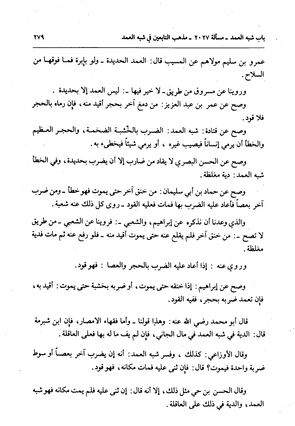 عَمْرُو بْنُ سُلَيْمٍ مَوْلَاهُمْ عَنْ الْمُسَيِّبِ قَالَ: الْعَمْدُ الْحَدِيدَةُ - وَلَوْ بِإِبْرَةٍ فَمَا فَوْقَهَا مِنْ السِّلَاحِ. وَرُوِّينَا عَنْ مَسْرُوقٍ مِنْ طَرِيقٍ - لَا خَيْرَ فِيهَا -: لَيْسَ الْعَمْدُ إلَّا بِحَدِيدَةٍ. وَصَحَّ عَنْ عُمَرَ بْنِ عَبْدِ الْعَزِيزِ: مَنْ دَمَغَ آخَرَ بِحَجَرٍ أُقِيدَ مِنْهُ، فَإِنْ رَمَاهُ بِالْحَجَرِ فَلَا قَوَدَ. وَصَحَّ عَنْ قَتَادَةَ: شِبْهُ الْعَمْدِ: الضَّرْبُ بِالْخَشَبَةِ الضَّخْمَةِ، وَالْحَجَرِ الْعَظِيمِ وَالْخَطَأُ أَنْ يَرْمِيَ إنْسَانًا فَيُصِيبَ غَيْرَهُ، أَوْ يَرْمِيَ شَيْئًا فَيُخْطِئَ بِهِ. وَصَحَّ عَنْ الْحَسَنِ الْبَصْرِيِّ لَا يُقَادُ مِنْ ضَارِبٍ إلَّا أَنْ يَضْرِبَ بِحَدِيدَةٍ، وَفِي الْخَطَأِ شِبْهِ الْعَمْدِ: دِيَةٌ مُغَلَّظَةٌ. وَصَحَّ عَنْ حَمَّادِ بْنِ أَبِي سُلَيْمَانَ: مَنْ خَنَقَ آخَرَ حَتَّى يَمُوتَ فَهُوَ خَطَأٌ - وَمَنْ ضَرَبَ آخَرَ بِعَصًا فَأَعَادَ عَلَيْهِ الضَّرْبَ بِهَا فَمَاتَ فَعَلَيْهِ الْقَوَدُ - رَوَى كُلُّ ذَلِكَ عَنْهُ شُعْبَةُ.